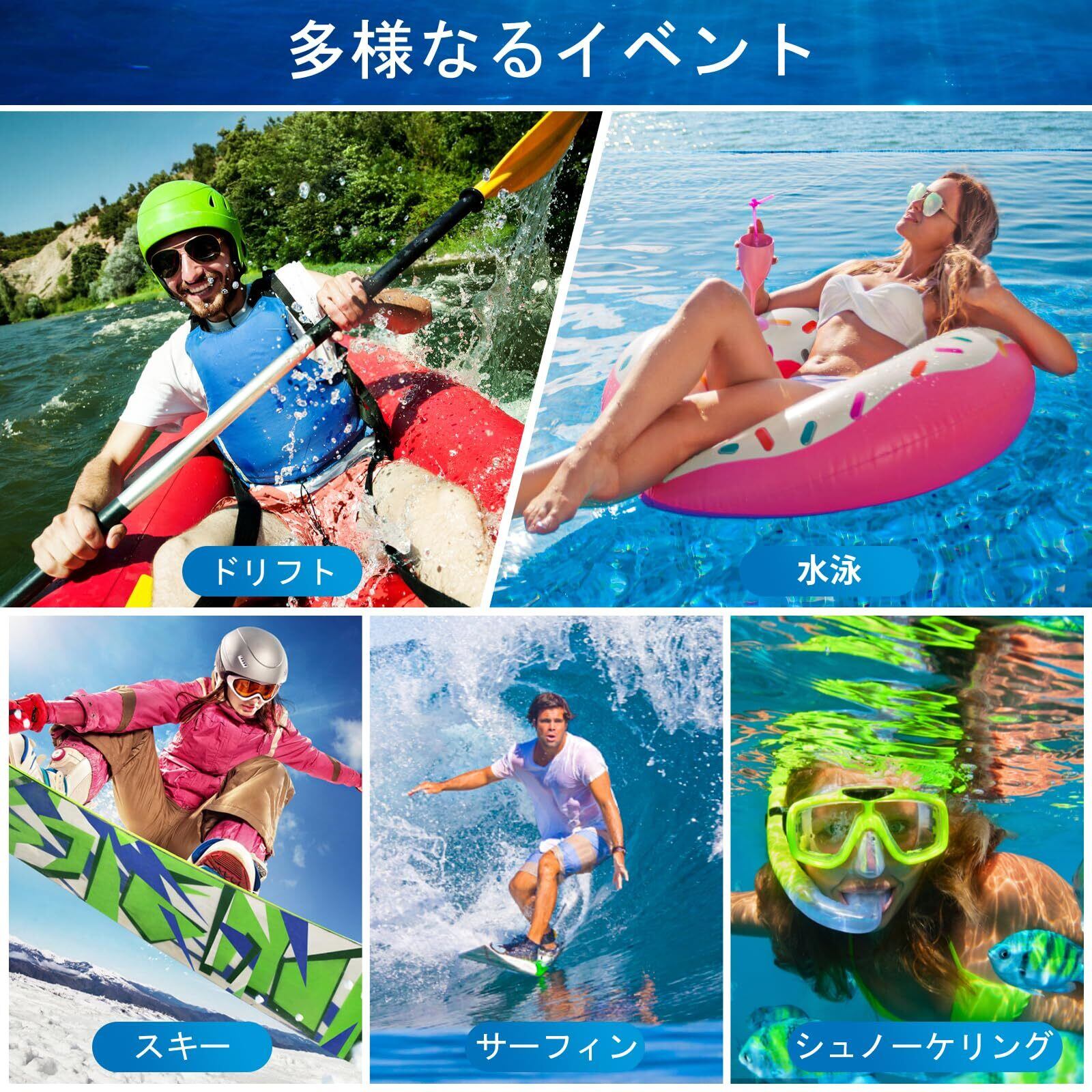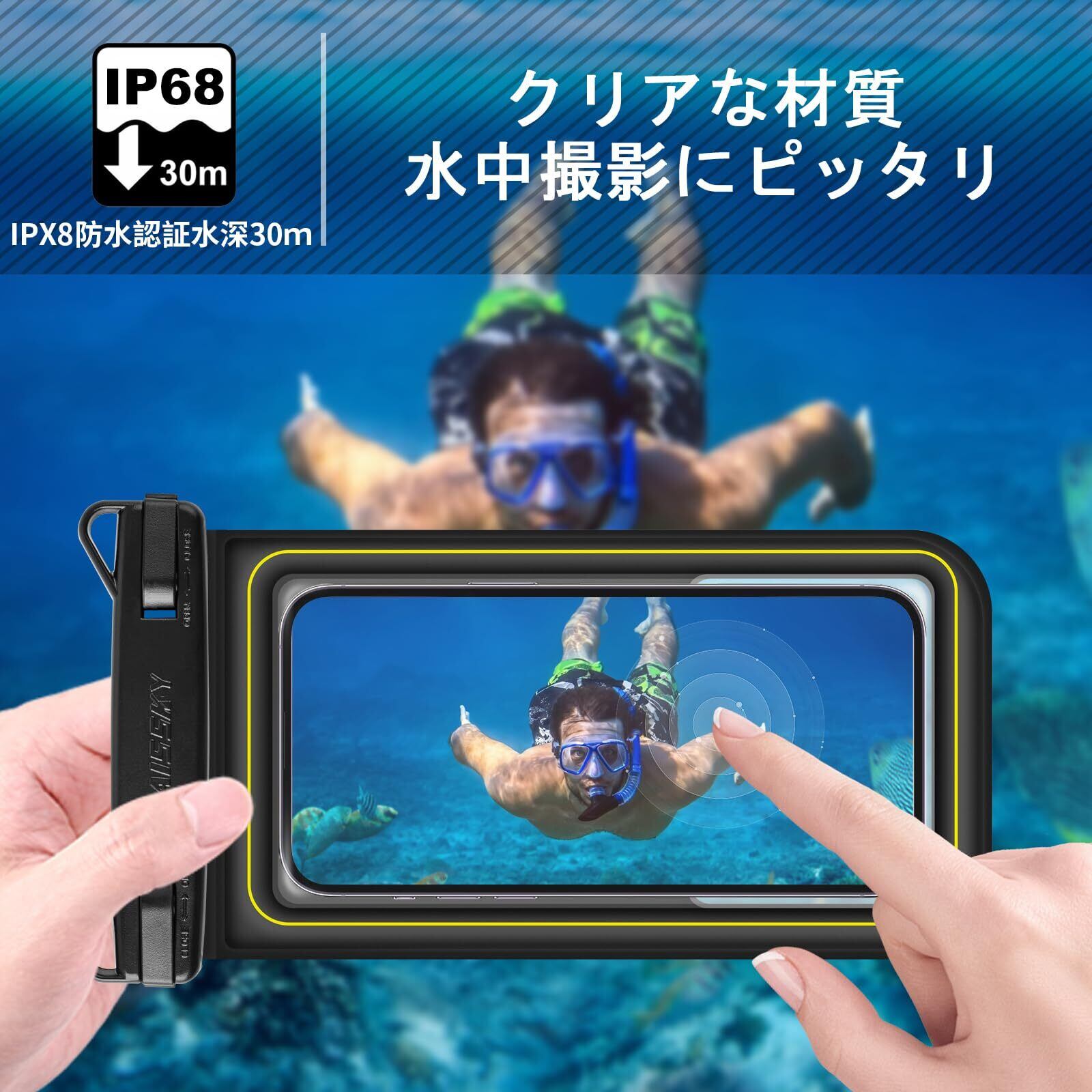 「水に浮く・スポンジ設計」※この防水スマホケースには水に浮くことができます。「U型フローティング構造」が採用されており、中心にスポンジ製で、ボーダー部分が空気がいれたため浮き輪となれて、仮に海に落とされても、とにかく沈みません。更に、このデザインで落下した衝撃を分散・吸収し、中身のスマホがダメージを受けず、全方位からしっかりと守られます。