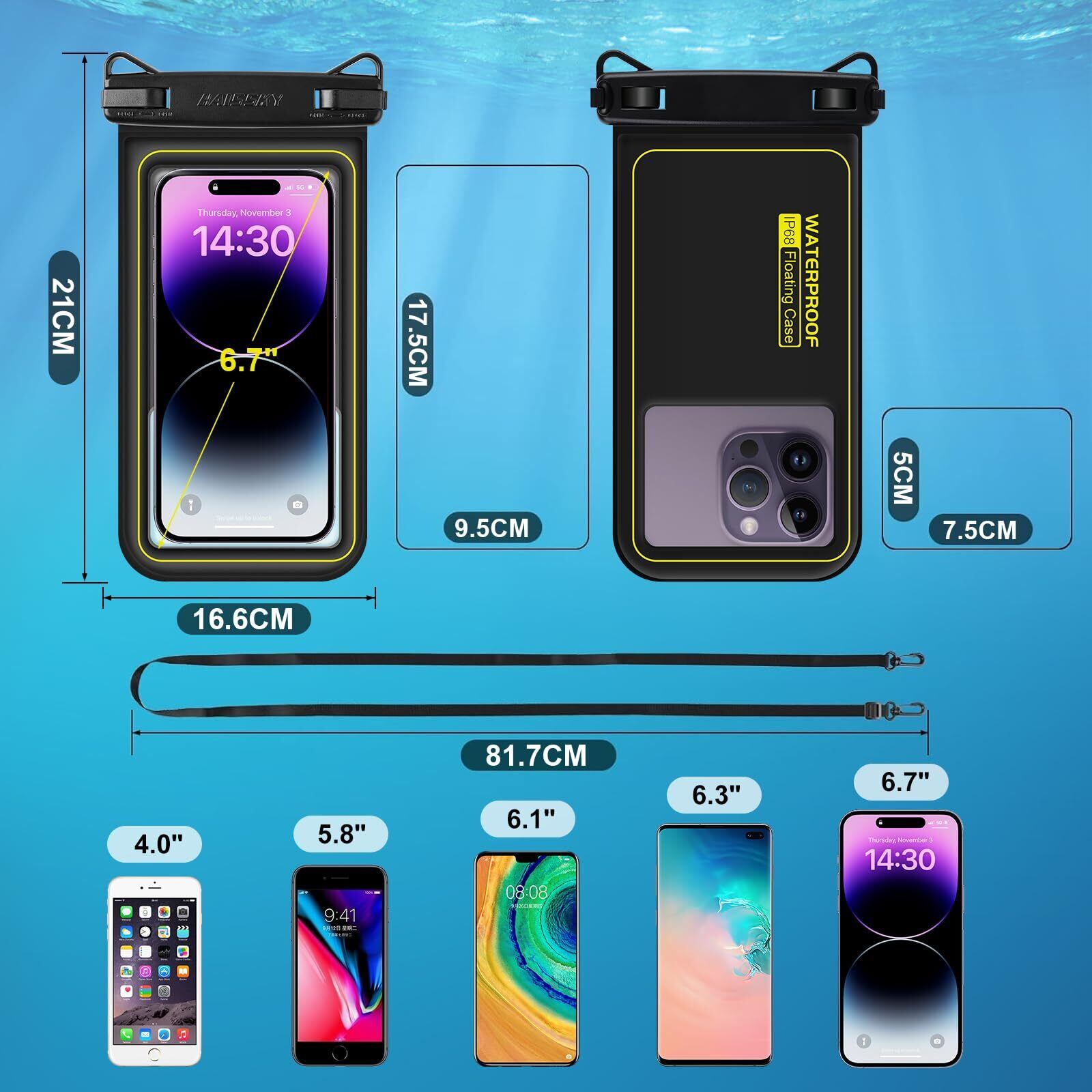 「調整ベルト・楽しさ倍増」携帯スマホ防水ケース海に付属したストラップの長さの調整範囲:44cm~82cm。場合によって様々な長さでご利用ください。プールで水泳、潜水、海辺での撮影、お風呂、スキー、雪遊び、温泉、料理、釣りなど様々なアウトドアとレジャーの場合に役に立てて、海辺に掛け替えないスマホグッズです。