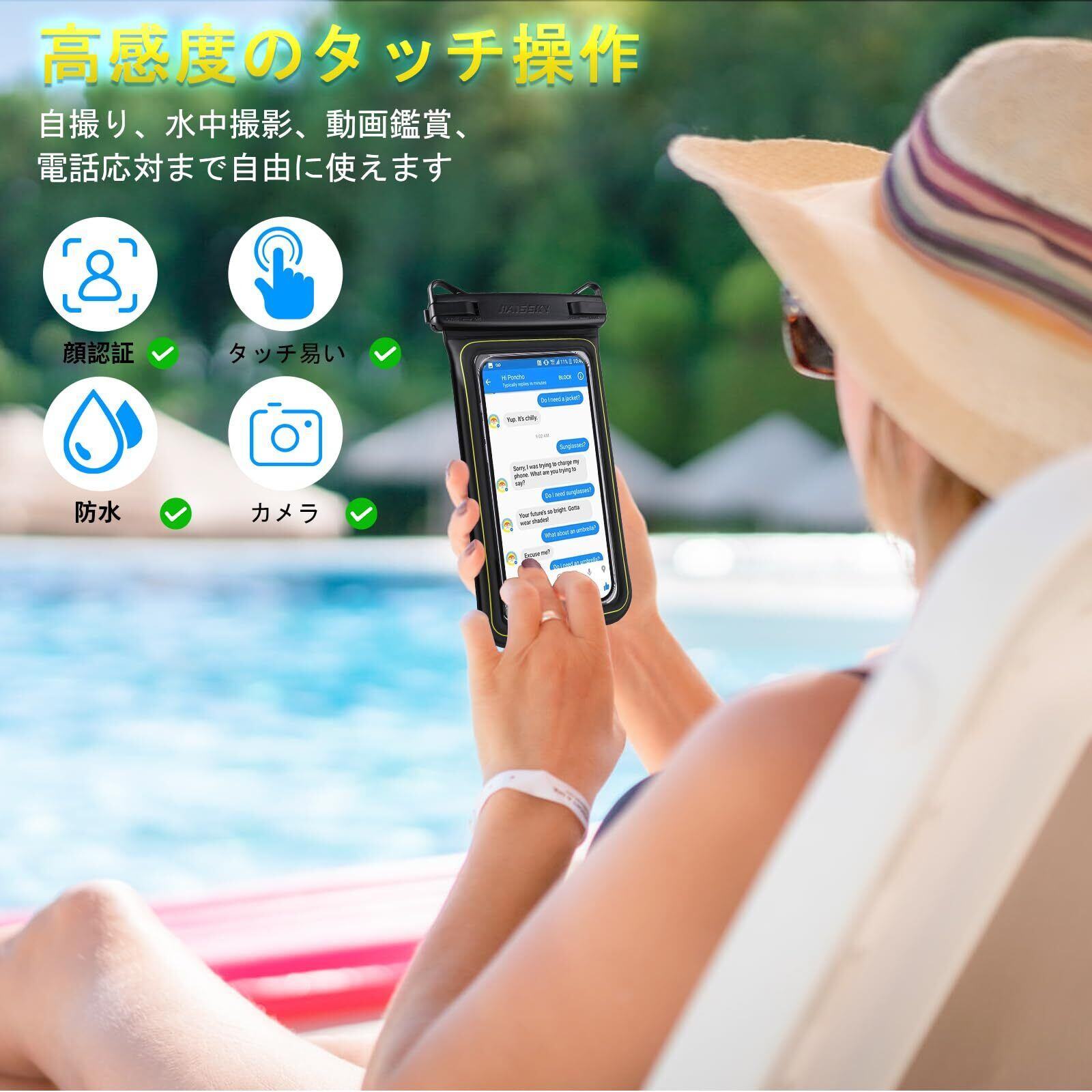 「水中撮影・顔認証」このスマホ防水ケースはお風呂やスキーにも自由に対応できます。スマホポーチの表面は高透光で、光の透過率は99.99%を超え、顔認証も一瞬で完了。また、防滴デザインのため水滴が残ったり,曇ったりはしません。いつでもクリアな画面、気楽に水中撮影ができます。また、タッチ操作や電話応対などの操作もスームズにできます。