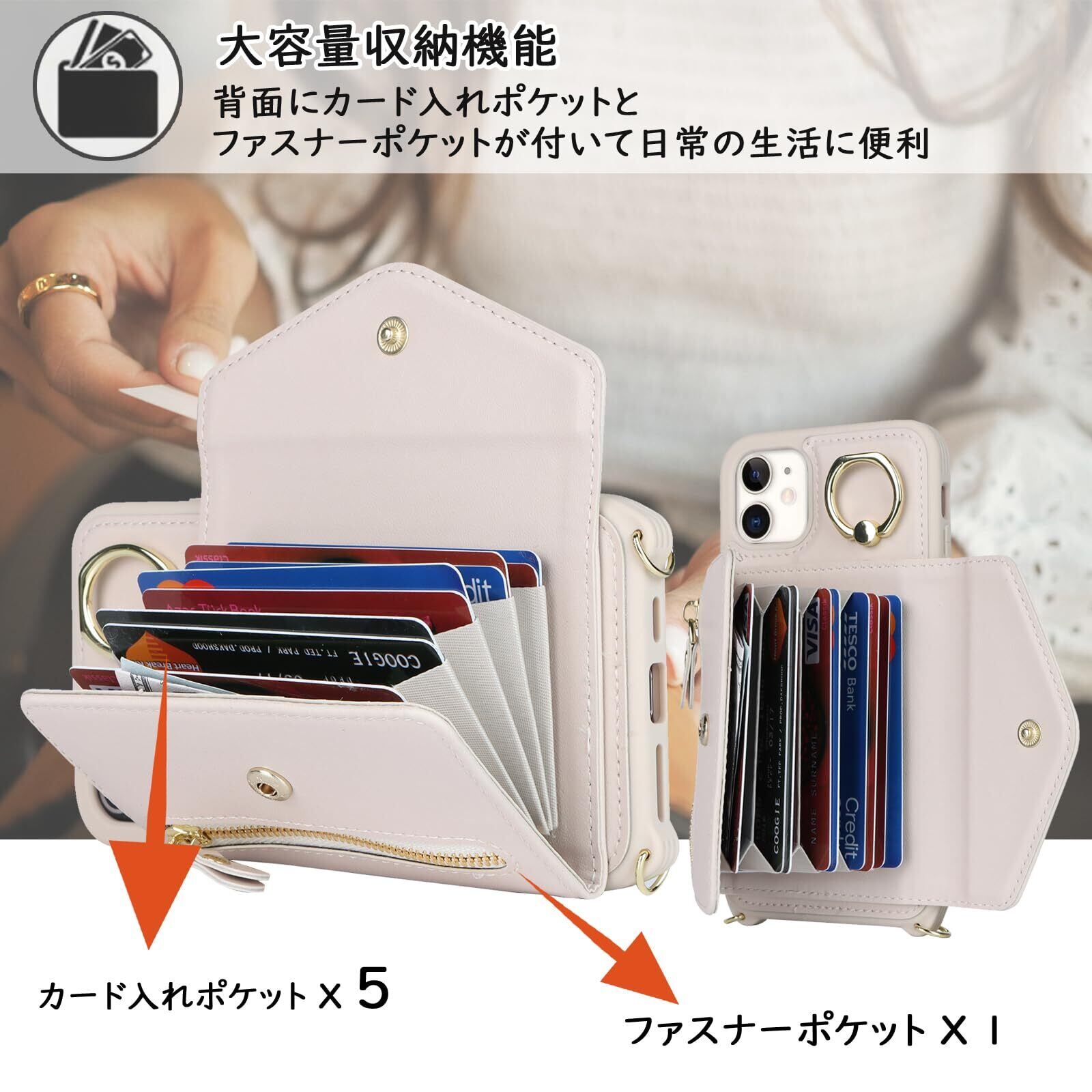 【大容量収納機能】背面にカード入れポケットが五つ付いてい、カードを8~10枚入れることができます。ファスナーポケットも付いています。カード類や紙幣 、名刺、免許証などを入れることができ、日常の生活に便利。