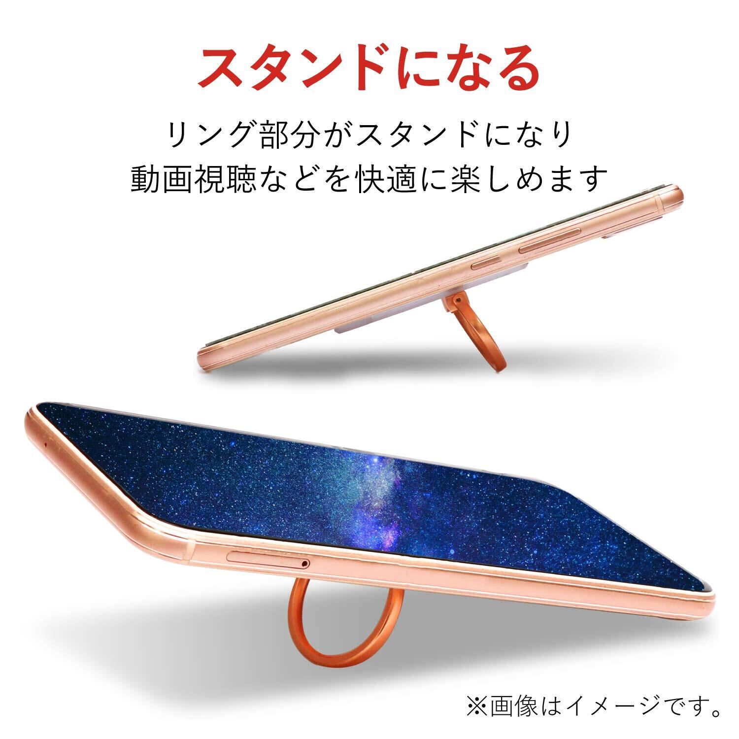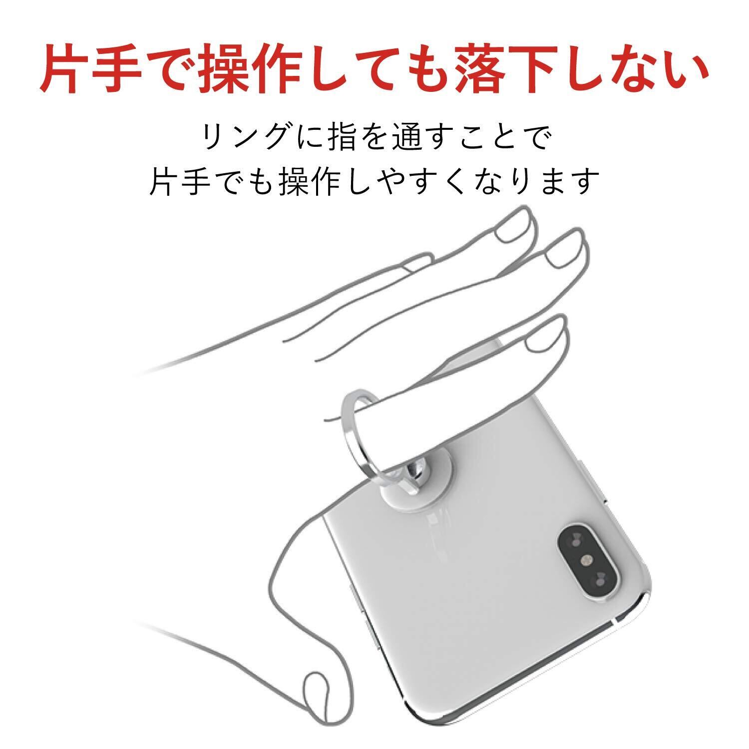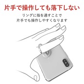 ●背面に貼りつけることで指を通してスマートフォンを持つことができ、スマートフォンの落下を防ぐフィンガーリングです。●機器本体やケースの柄を隠さないスタンダード・クリアタイプです。●持ち方に合わせてリングが回転し、持ちやすい角度に調整可能です。●動画視聴時にリング部分がスタンドになる、便利なスタンド機能がついています。●エレコム社試験をクリアした吸着シートにより、使用中にスマートフォンから剥がれるのを防止します。●リング部分はスマートフォンのカラーと親和性の高いメタリックカラーを採用しています。