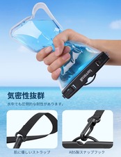 【ロック装置・取付簡単・ストラップ付き・両手解放】ストラップ全体長さ:47.5cm。 他の紐式と違い、耐衝撃性の高いABS樹脂製のスナップフックで、両手解放の上に貴重品を徹底的に守ります。ロック装置が付いているため気密性の高い状態をキープでき、保護性能に優れています。ロックボタンはシンプルな設計なので、着脱もストレスなく行えるでしょう。注意ガタの音が聞こえるまで完全にロックされないです。装着前に、製品の破損の有無をご確認ください。乾燥した場所で本製品を装着してください。装着後に、防水テストを行い、水漏れがないかの確認をしてください。水温が50℃以上の水で利用するのは避けてください。