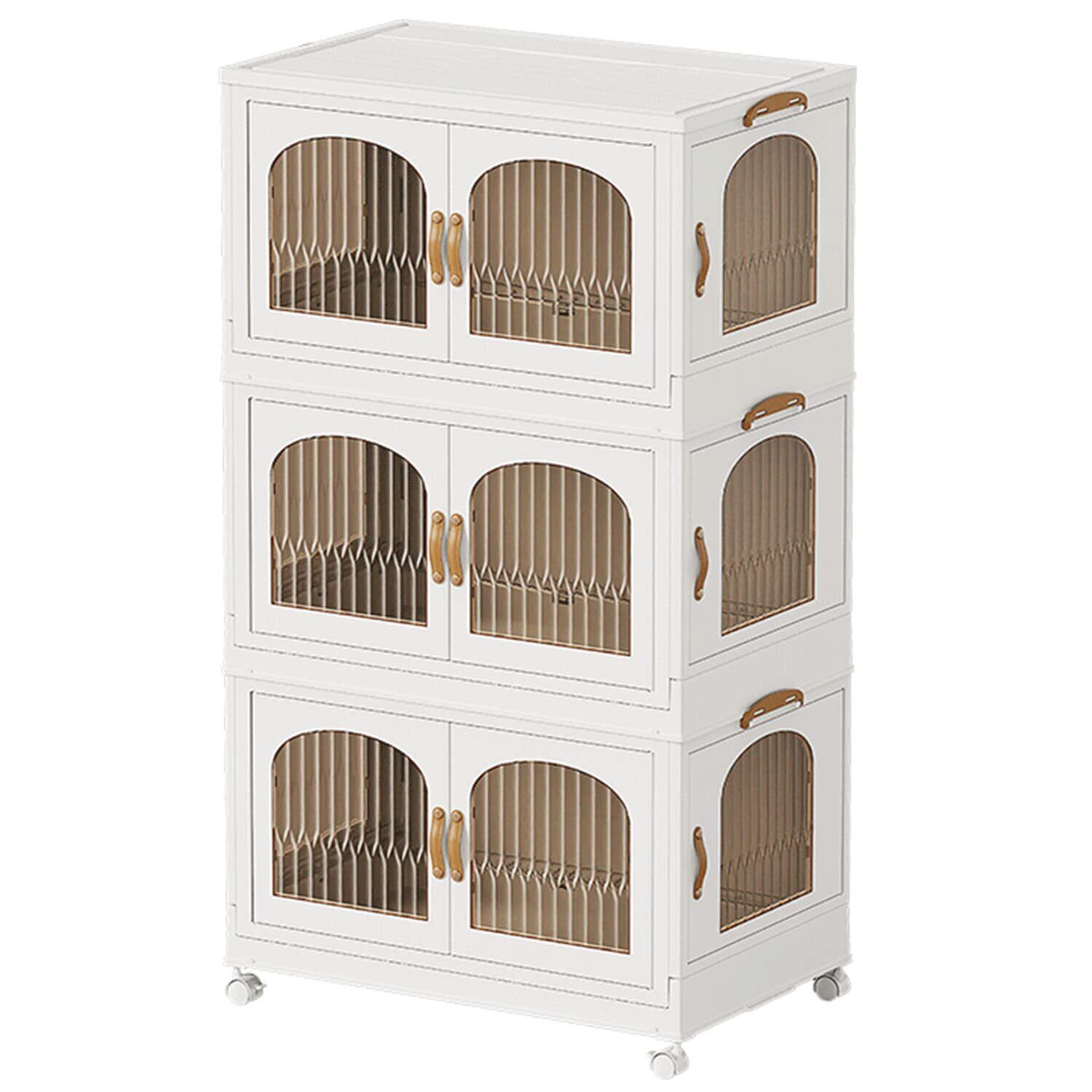OTYTY コンテナ ボックス 収納棚 キャビネット 収納ボックス 折り畳みコンテナ キャスター付き ふた付き 一体型3段式 55cm*32.5cm*96.5cm 3面扉 収納ワゴン 本棚 おしゃれ ホワイト 書類/衣類/布団/おもちゃ/食品収納 キッチン/リビングルーム/ベッドルーム/オフィス収納