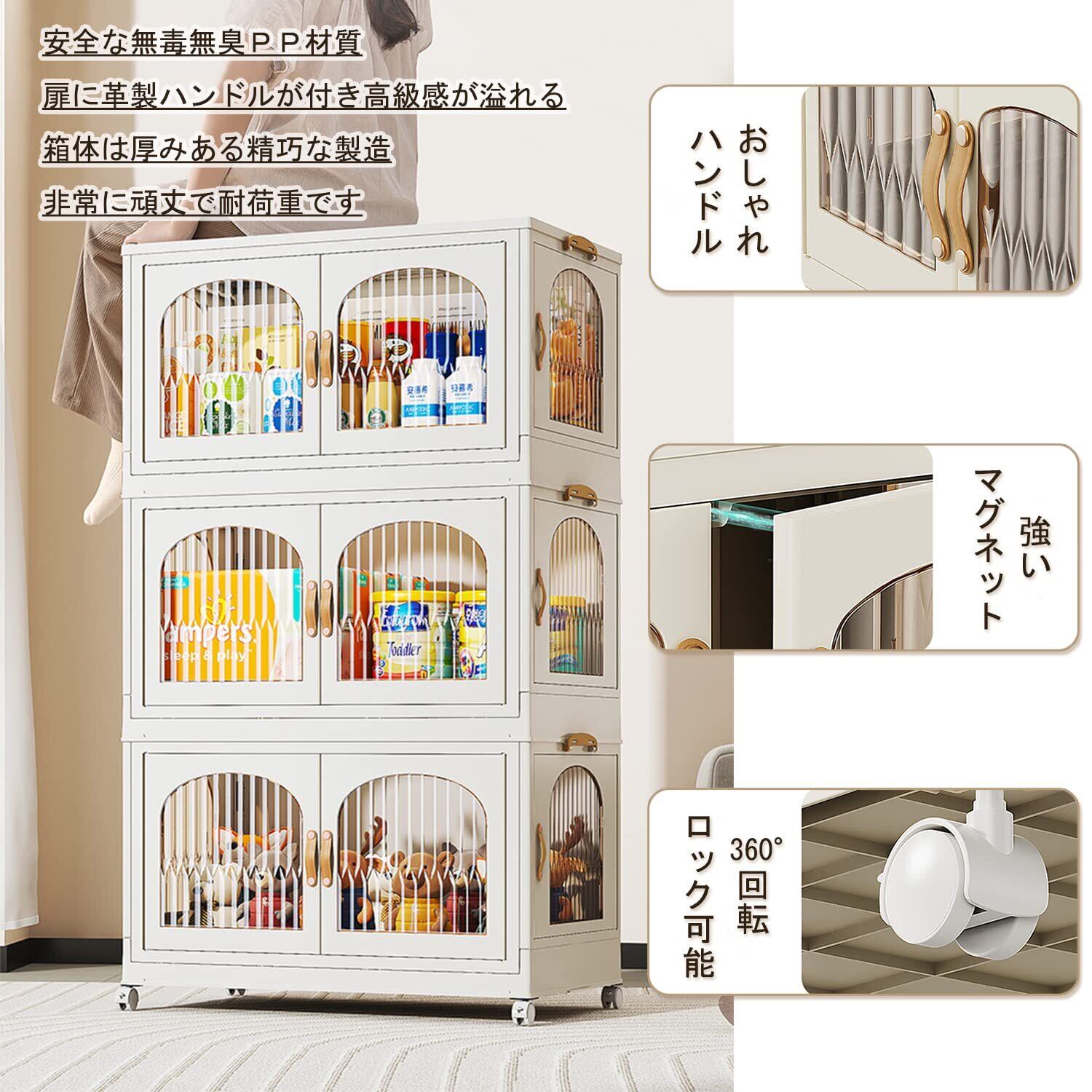 【四面から開く折りキャビネット】 従来の収納ボックスの悩みを解決する革新的な折りたたみ式キャビネット!360°回転可能なキャスターがついています。伝統的キャビネットに比べて移動しやすいです。収納ワゴンの移動性とキャビネットの防塵防湿の利点に合わせてこの多段収納ボックスが生まれた!側面三面と上蓋、4面から物を取り出せるので、大変便利です。キャビネットの位置制限の問題も解消されます。上部は平らで、上に物を置けます。装飾品や普段持ち歩くものを置いたりすることもできます。リビングルームの収納キャビネットとして、寝室のベッドサイドテーブルとして、クローゼットの中で衣類や布団を収納することも最適です!外観デザインがシンプルでおしゃれなので、どこに置いても素敵に見えます。ピクニックやキャンプに持っていくと、収納力が十分なだけでなく、外見も非常に魅力的で注目を集めます!
