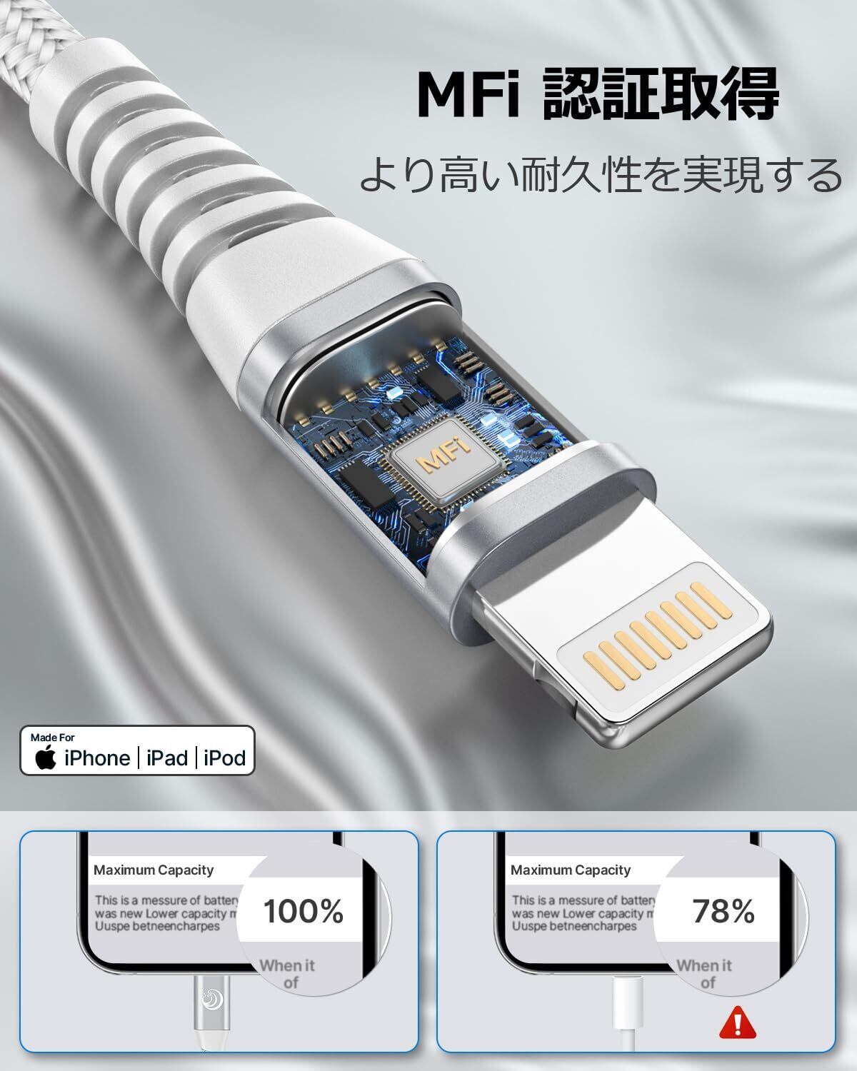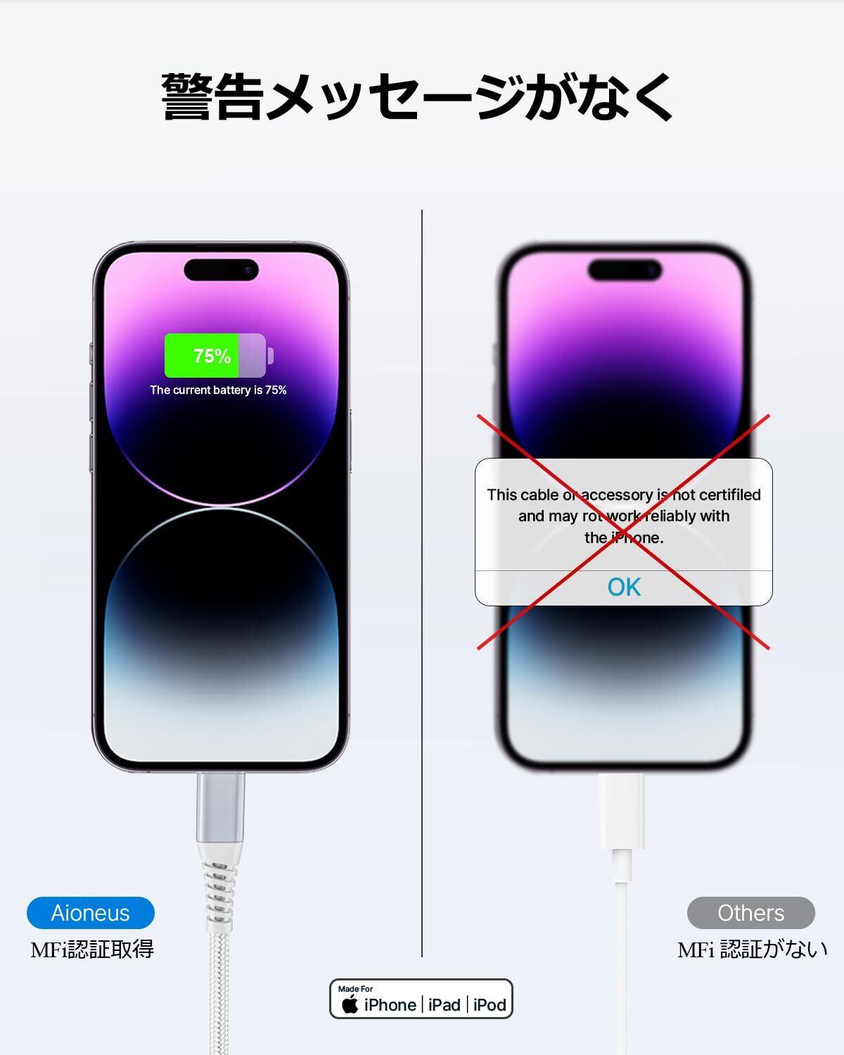 【MFI認証】AioneusのiPhone充電ケーブルはLightningコネクタ向けに特別に設計されています。MFi認証を取得し、過熱保護、過電圧保護、過充電保護などの複数の保護機能を備えており、デバイスの安全な充電を保証します。
