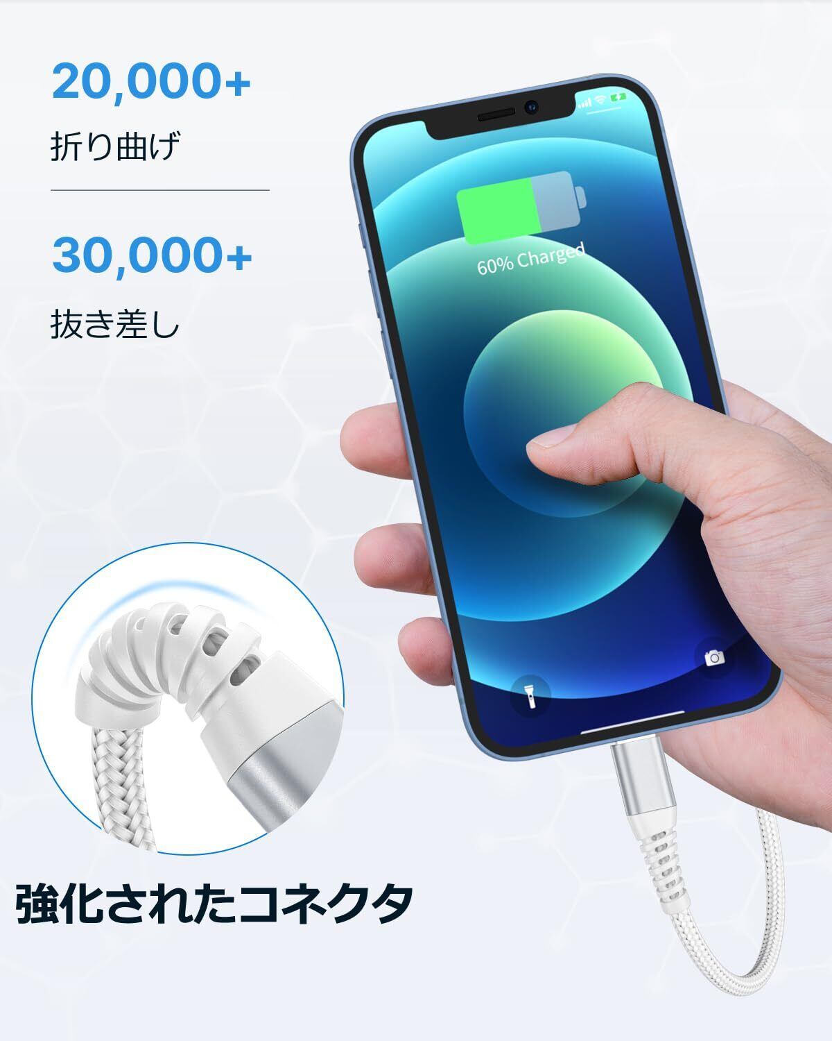 【強化された耐久性】ナイロンの二重編み込み素材を採用し、丈夫で信頼性の高いライトニングケーブルを提供します。20,000回以上の曲折テストにたえて、市販の他のデータケーブルよりも強度と耐久性に優れています。