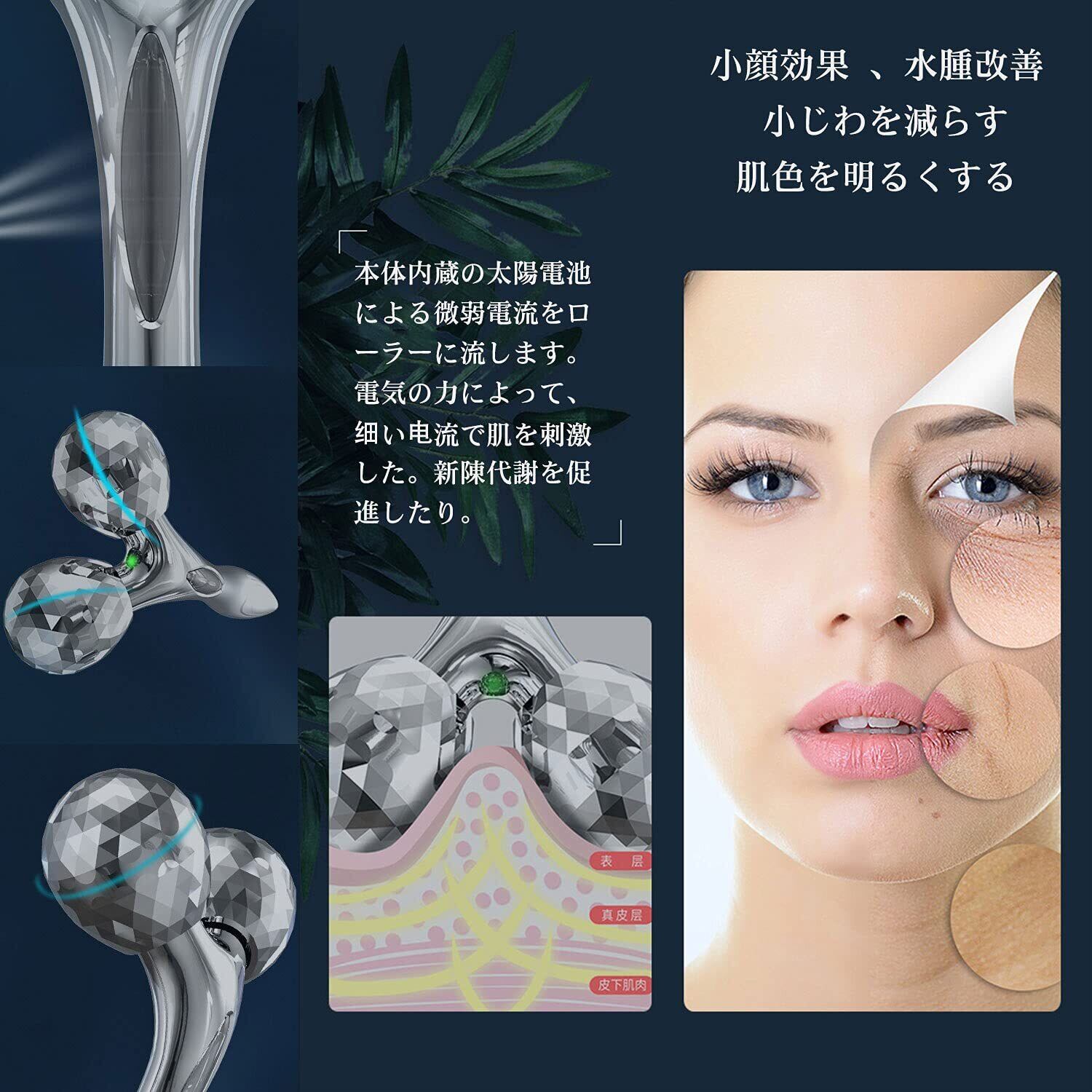 【微電流式美容ローラー+(ギフトT字型の目元エステ)】充電不要式、ハンドルに設けられたソーラ一パネルから光を取り込み、微弱電流「マイクロカレン卜」を発生させます。 充電不要、パネルから光を取り込み、微弱電流「マイクロカレン卜」を発生させできます。電気の力によって、细い电流で肌を刺激した。新陳代謝を促進したり。むくみ、ハリ、しわの消去に効果もあります。また、肌のハリが生まれるなどの効果も得られます。製品はソーラーパネルを介して微弱電流を発生させることができます。微弱電流を人体に作用させることができ、非常に弱いので、肌が感知できません。T字型の目元エステ、しわやたるみ、くまなど目のこりや血行をよくしたい方に。そのため、疲れ目の改善に効果的です。