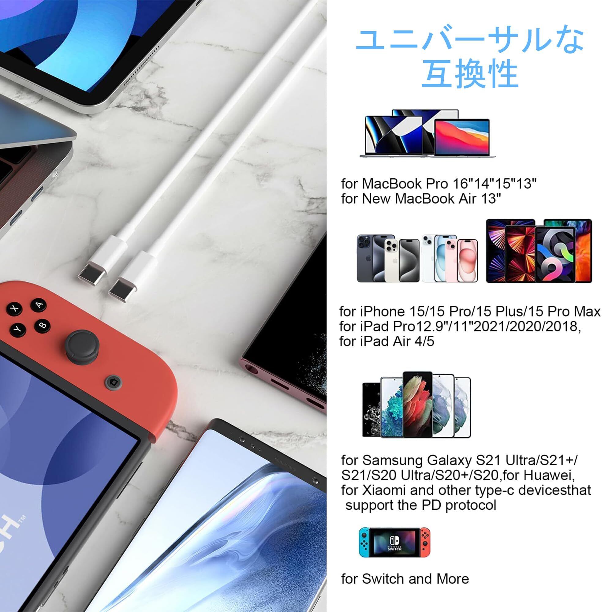 幅広い互換性:本 USB-C & USB-C ケーブルは、スマホ、タブレット、ノートPC、ゲーム機及びその他のUSB-C機器に充電とデータ転送を対応します。for Phone16 / Phone16 Plus / Phone 16 Pro / Phone 16 Pro Max/ 15 / Phone15 Plus / Phone 15 Pro / Phone 15 Pro Max, for Galaxy S23 ultra/S22/S21, for Pad Pro 2020/2022, Pad Air 5/4, Pad mini 6, Mcbook Air, McBook Pro , など様々なUSB type cデバイスに対応できます。