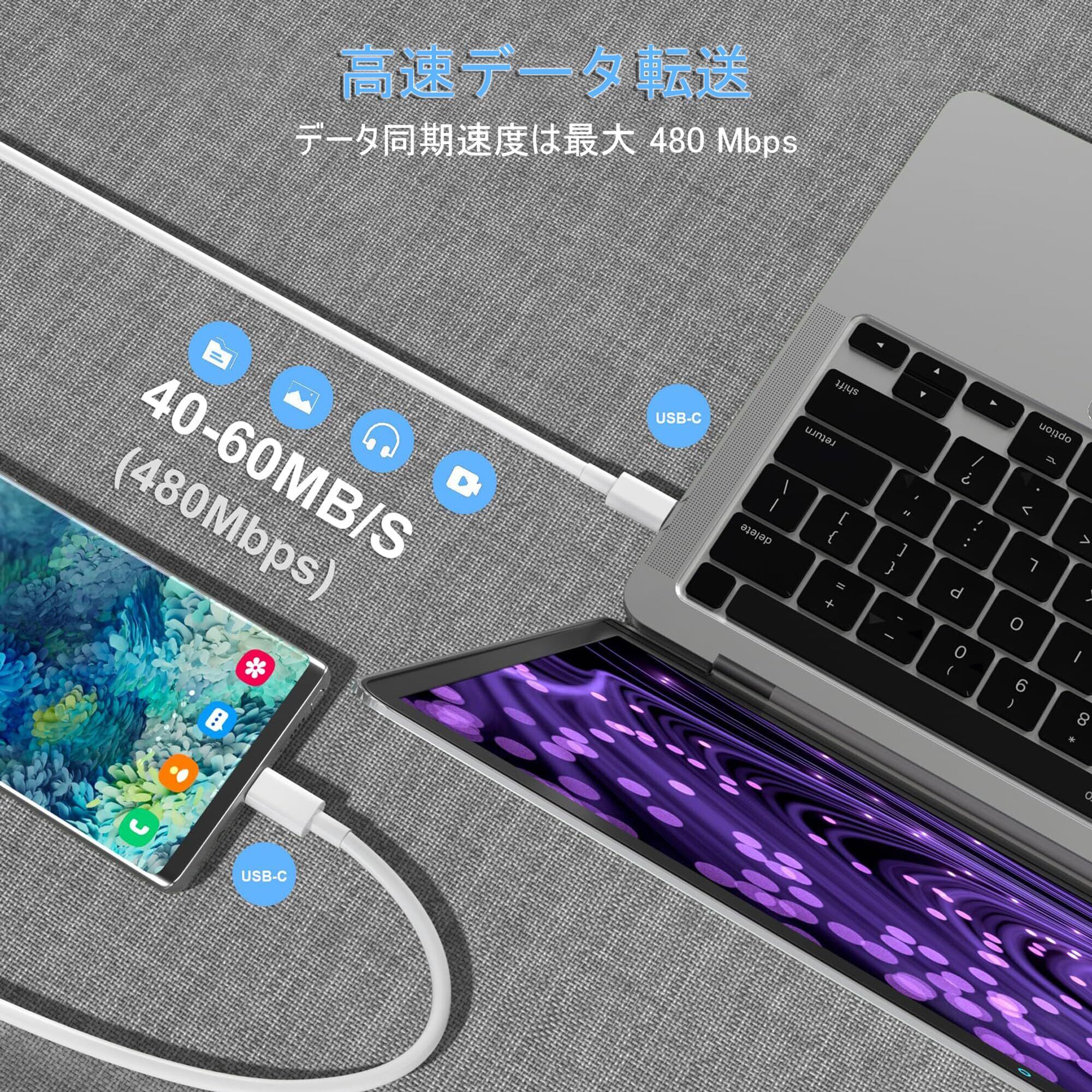 最大60W急速充電:このPD3.0 USB-C & USB-CケーブルはUSB Power Delivery技術を採用し、最大3Aの電流と5V、12V、20Vの電力をサポートし、最大60W出力の急速充電をサポートします。 USB 2.0規格で最大480Mbpsのデータ転送速度をサポートします。 (ご注意: 急速充電には18W以上の出力の充電器を使用してください。)