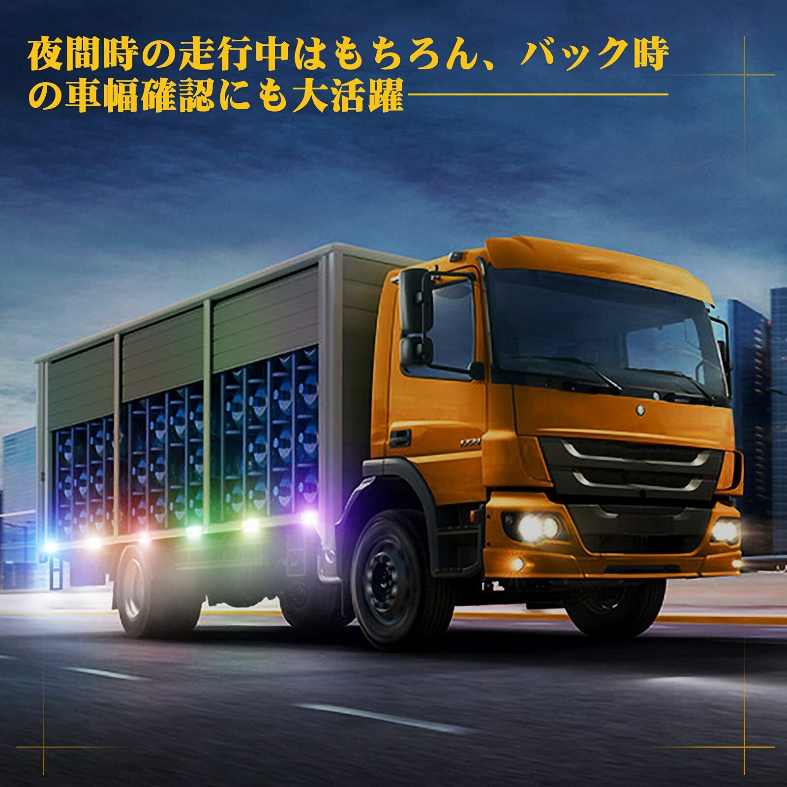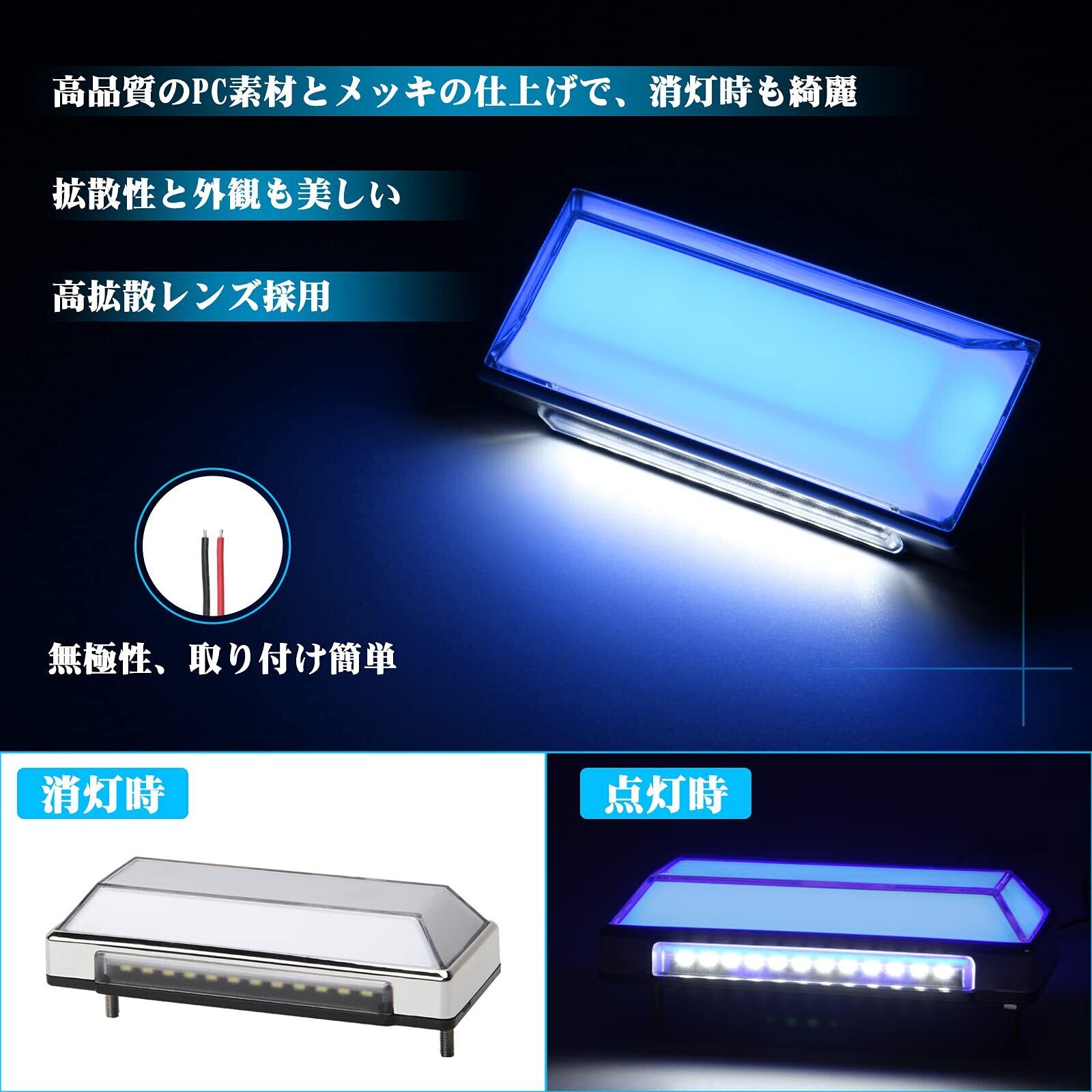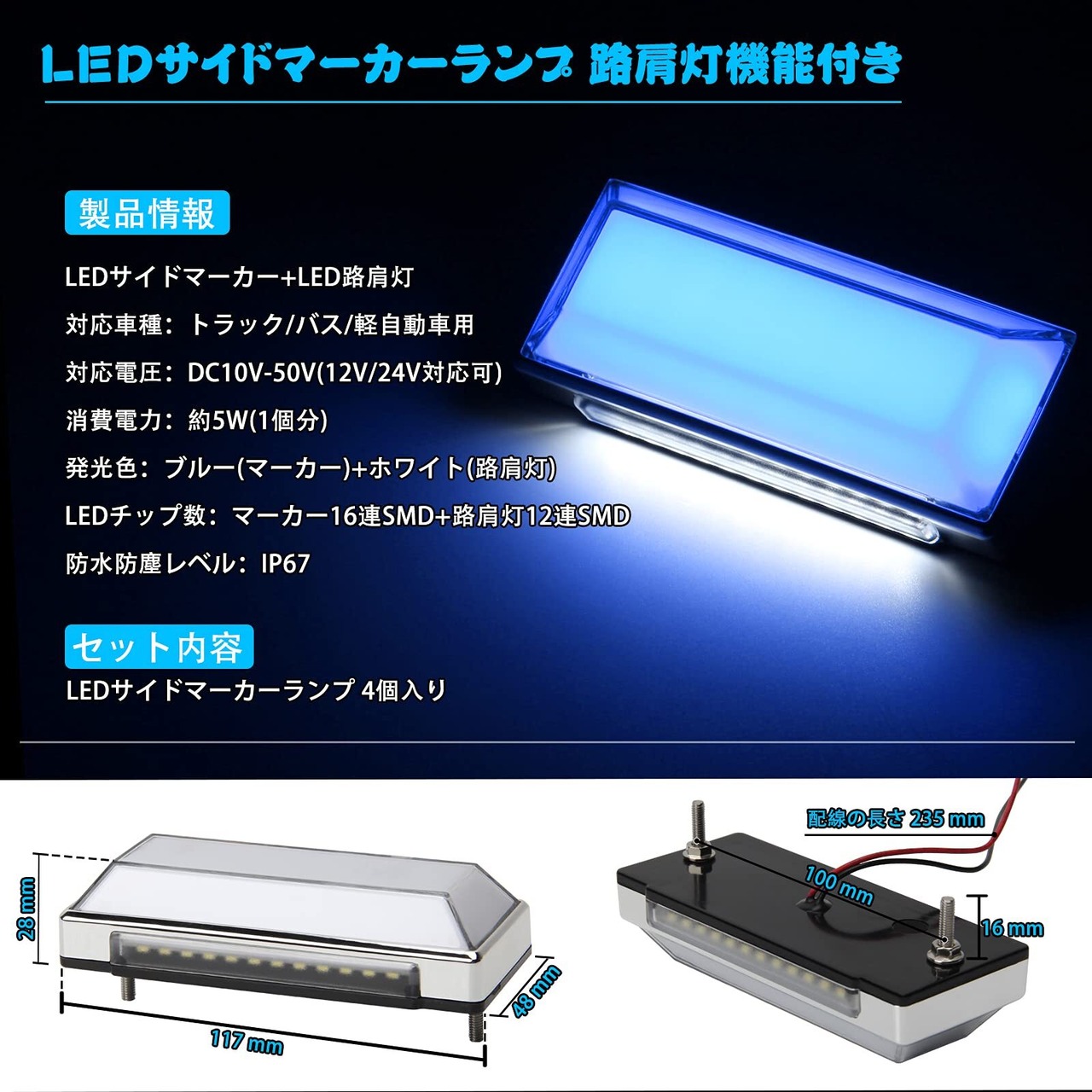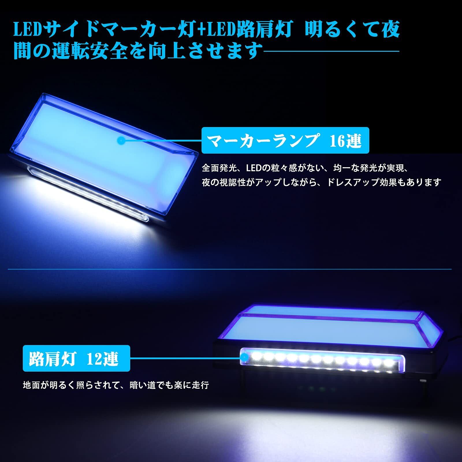 製品情報:LED サイドマーカーランプ LED路肩灯機能付き、発光色:2色 ブルー(サイドマーカー)+ホワイト(路肩灯)、対応車種:12V/24V汎用 トラック バス 軽自動車など、取り付け:ランプを車体のサイドに固定して、+-極の配線を接続だけで取り付け完了、セット内容:マーカーランプ4個入り。