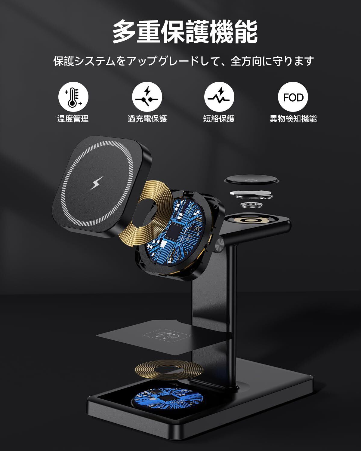【2025新登場】HOUOA ワイヤレス充電器 Magsafe充電器 3in1 マグネット式 マグセーフ充電器 Qi急速充電 同時に3つのデバイス充電 15W/10W/7.5W iPhone/Apple Watch/Airpodsに対応(日本語説明書,18WQC3.0アダプター付属)ブラック