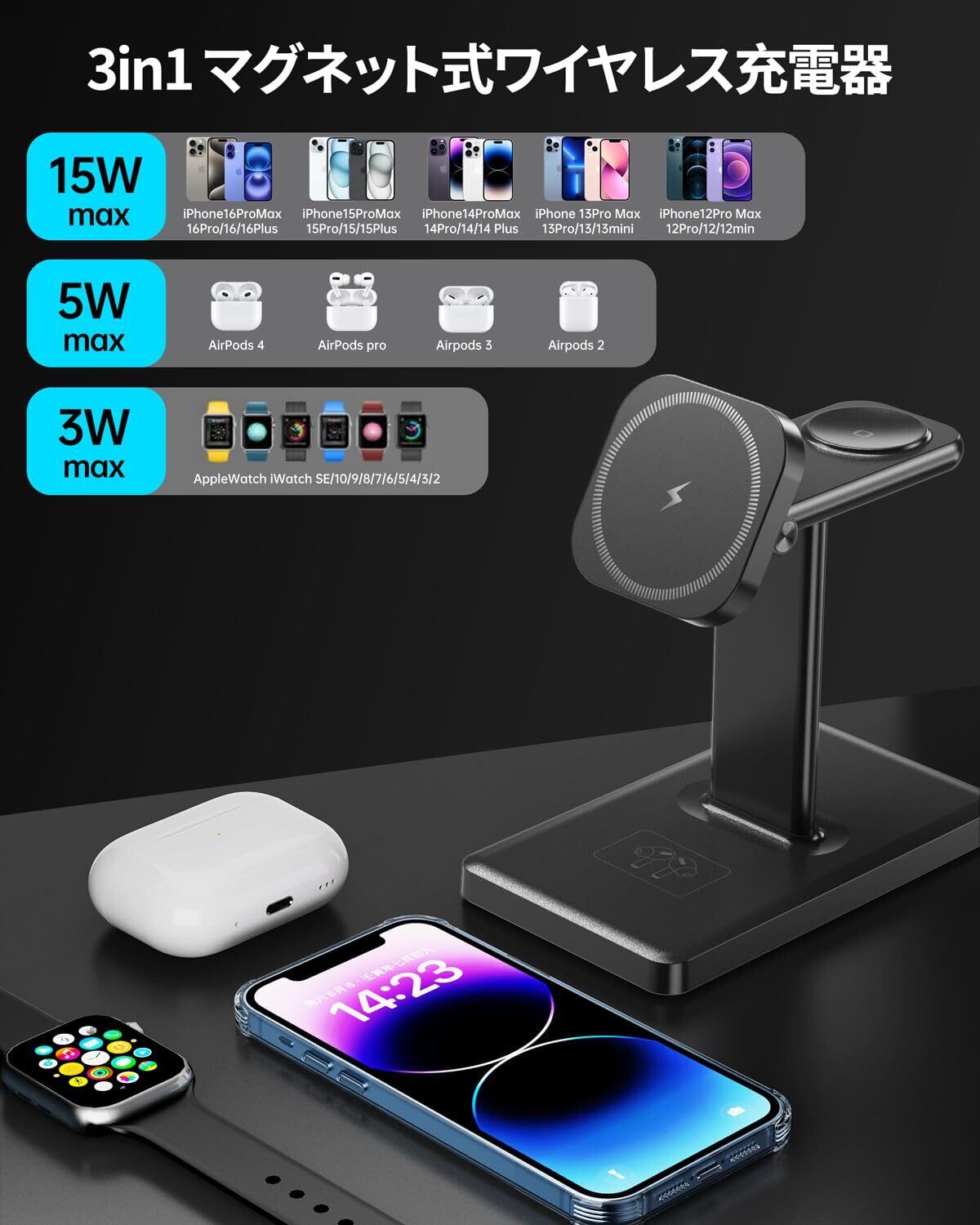 【特価商品】【2025新登場】HOUOA ワイヤレス充電器 Magsafe充電器 3in1 マグネット式 マグセーフ充電器 Qi急速充電 同時に3つのデバイス充電 15W/10W/7.5W iPhone/Apple Watch/Airpodsに対応(日本語説明書,18WQC3.0アダプター付属)ブラック