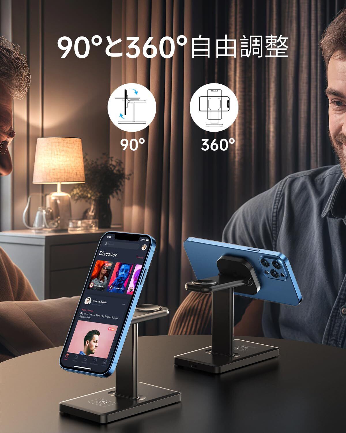 【3in1ワイヤレス充電器&MagSafe対応】HOUOA 3in1ワイヤレス充電器は優れたパフォーマンスとスタイリッシュなデザインを採用し、同時にiPhone、Apple Watch、AirPodsを充電できます、乱れた充電ケーブルに別れを告げます、3in1のmagsafe充電器です。更に調整可能のスタンドを搭載します、0-90°角度を自由に調整します、充電スタンドとしてもピッパリです。