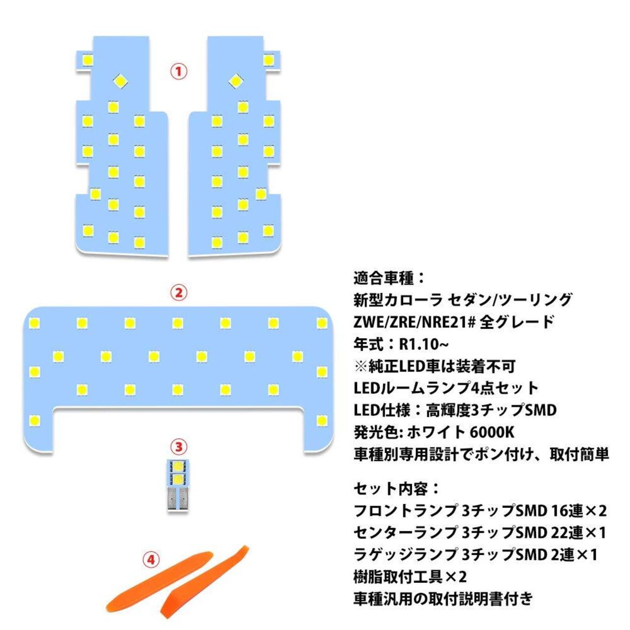 製品情報:LEDルームランプセット 【適合車種】: 新型 カローラセダン / カローラツーリング 年式:R1.10~ ZWE/ZRE/NRE21# 全グレード 対応可能、※純正LED車は装着不可 【発光カラー】ホワイト 6000K 【ルームランプセット内容】:フロントルームランプ×2、センタールームランプ×1、ラゲッジランプ ×1、全4点。