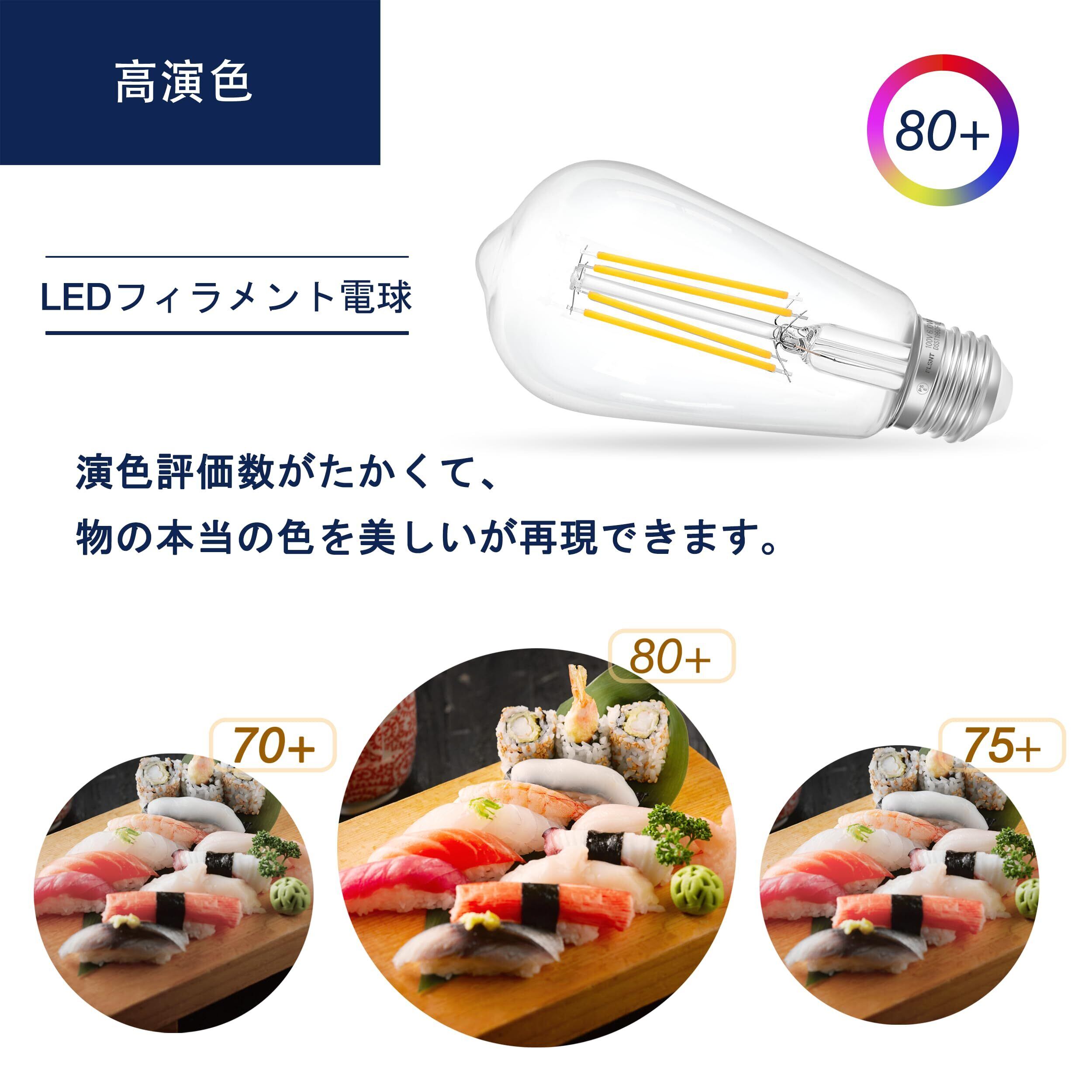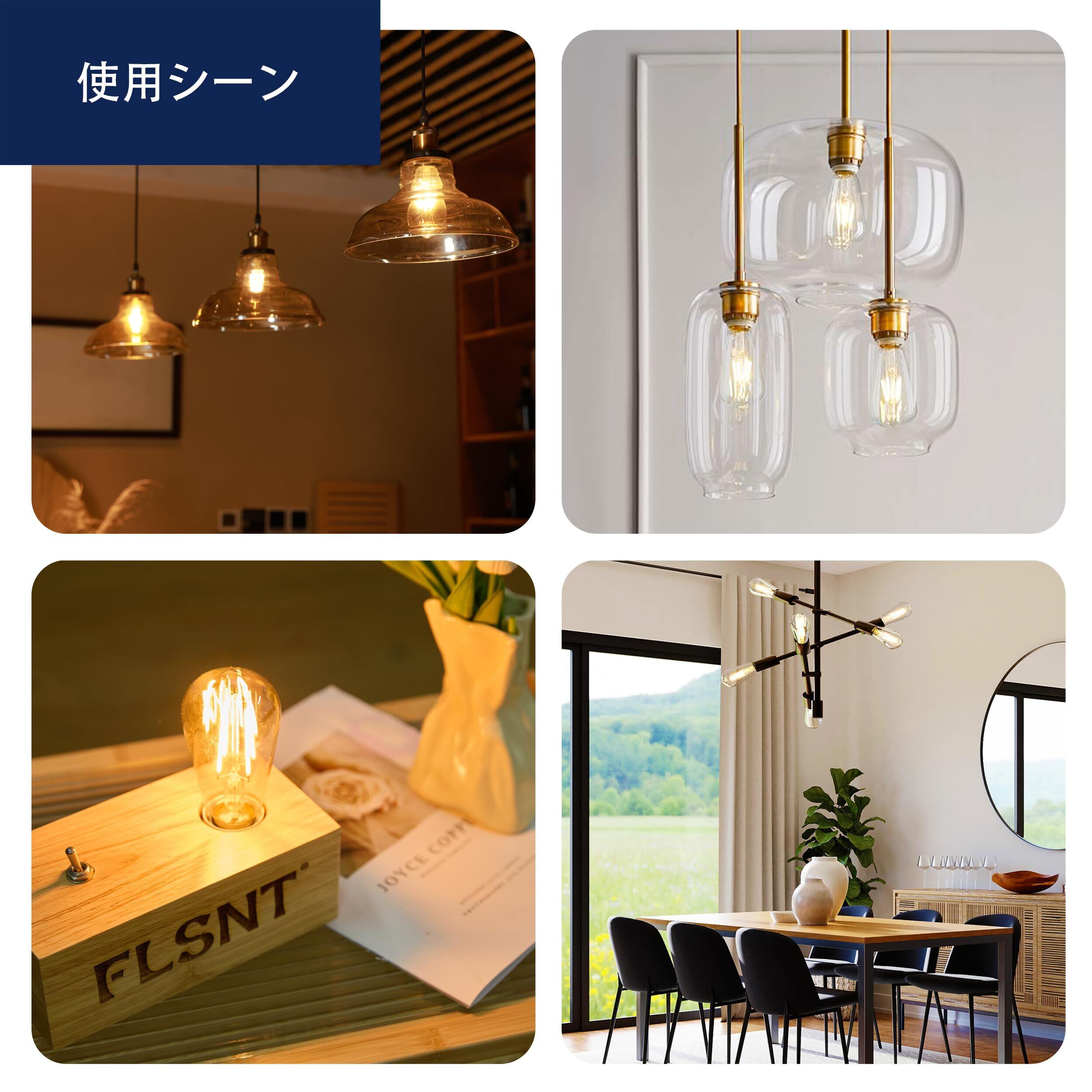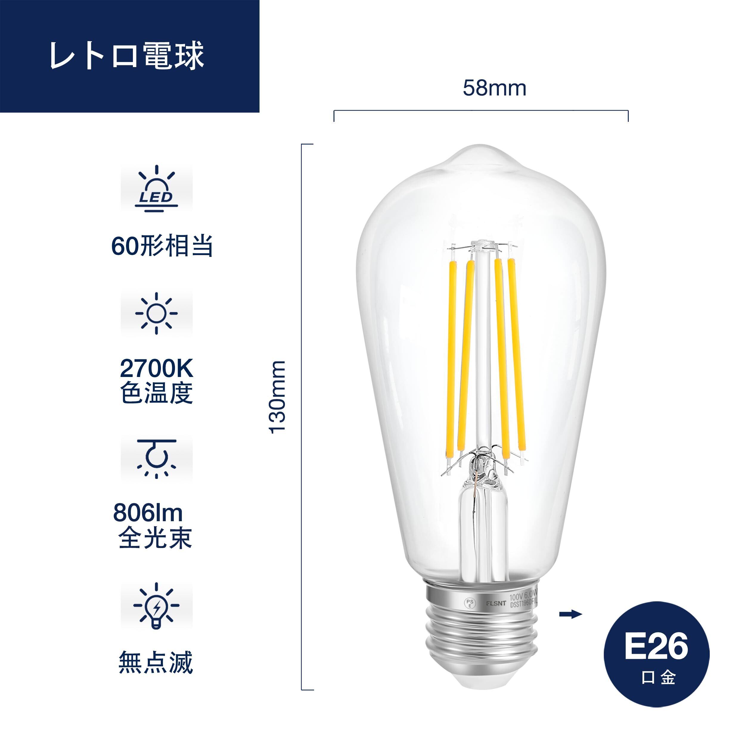 FLSNT LED電球 エジソン電球 E26 60W形相当 6W 806lm 2700K 電球色 フィラメント電球 エジソンランプ シャンデリア用 レトロ電球 雰囲気 高演色 広配光タイプ 非調光タイプ PSE認証済み 2個入