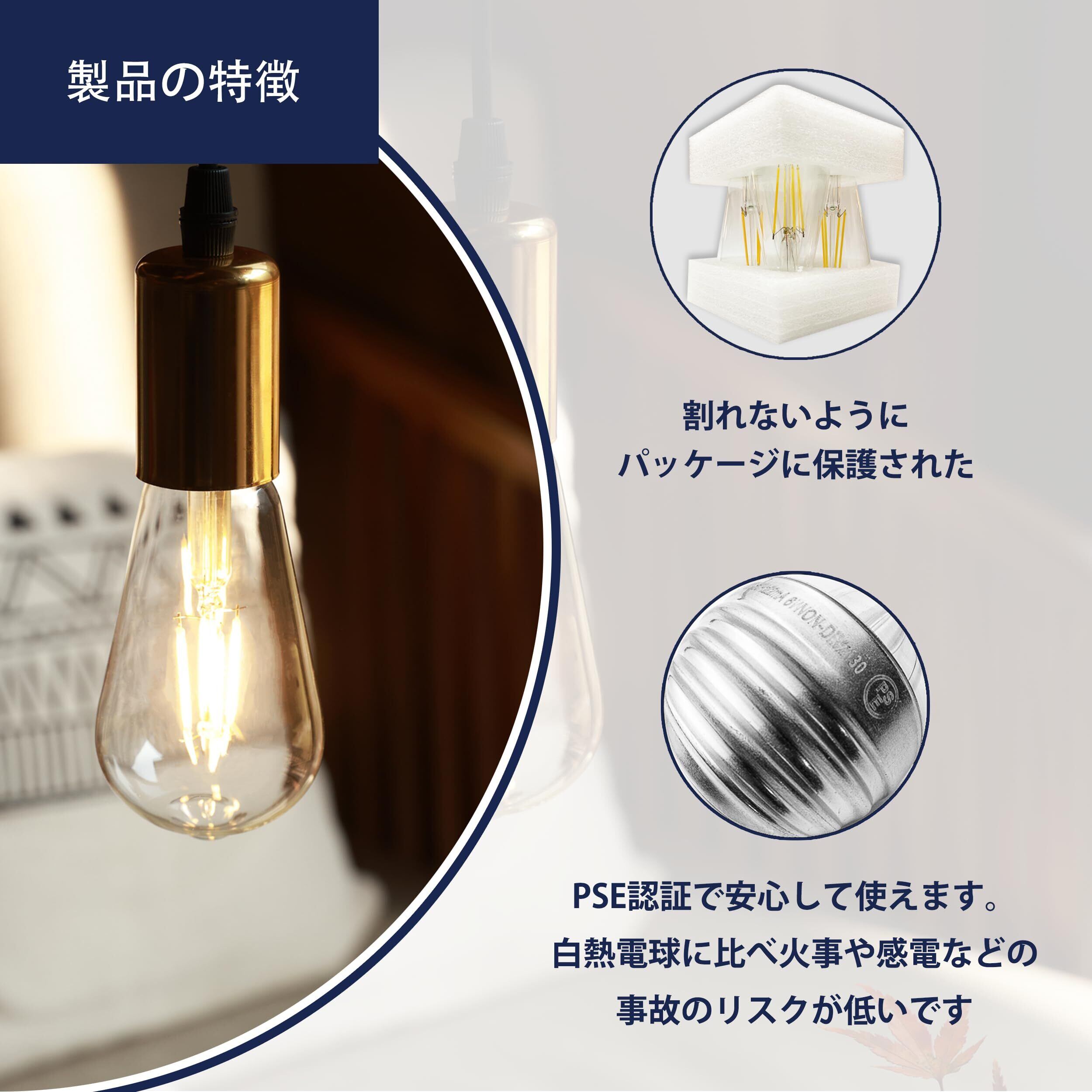 【レトロなデザイン】レトロ電球は照明自体を超えており、照らすだけではなく、芸術にも追従し、アートな光が空間を飾って、その材質と技術は製品自身にレトロで美しいファッションな外観を与えています。 お気に入りの照明器具に取り付けるだけでレトロな雰囲気を演出でき、癒しの空間づくりに最適なLED電球です