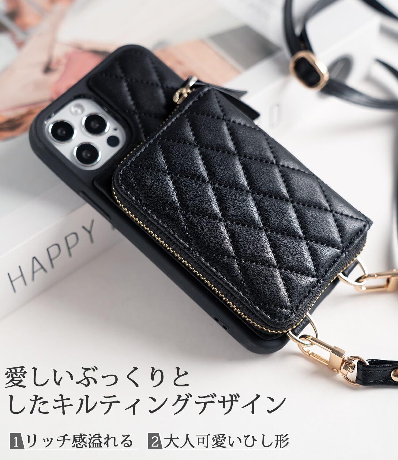 【おしゃれ iphone14 ケース 可愛い】高品質PUレザーを採用し。キルティン製法により、ひし形のチェック柄を作って、しなやかで柔らかいタッチ感とふんわり弾力感が共存。エレガントなゴールデントーン金具使用。リングやファスナーがキラキラと輝いて、おしゃれなアクセサリー感覚でお手元のスマホケースを彩る。全3色展開。落ち着いた色味ながら、お洋服にも合わせやすい。ご自身用はもちろん、お友達のお誕生日プレゼント、母の日のギフトなどにもおすすめ。