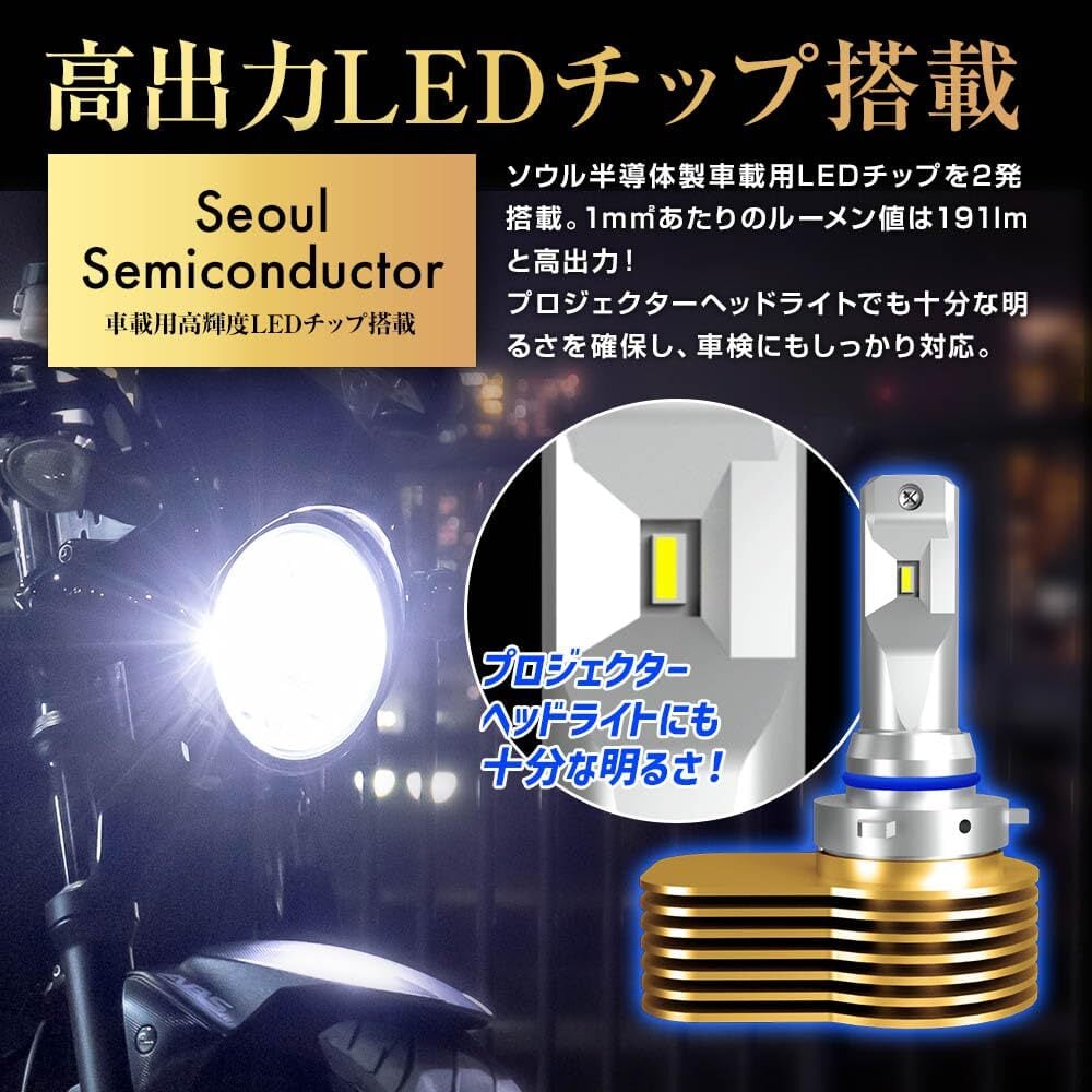 【プロジェクターヘッドライト対応】ソウル半導体製車載用LEDチップを2発搭載。1m㎡あたりのルーメン値が191lmと高出力であり、プロジェクターヘッドライトでも明るく、車検対応の十分な光量を確保。発光面を360度調整が可能で最適な配光を可能にする角度調整機能がついているので、レンズによる配光ズレを解消し、最大光度の出力が可能!