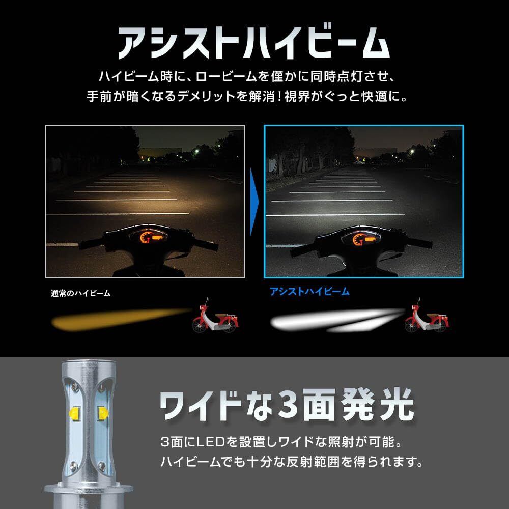 【ミニバイクでも視界広々】快適な配光を実現する3面発光を採用したことで、LEDの明るさをワイドに照射します。さらにアシストハイビーム機能を搭載しており、ハイビーム時に僅かにロービームを同時点灯することで、手前側も明るく照らしハイビーム走行の視界がぐっと快適になります。