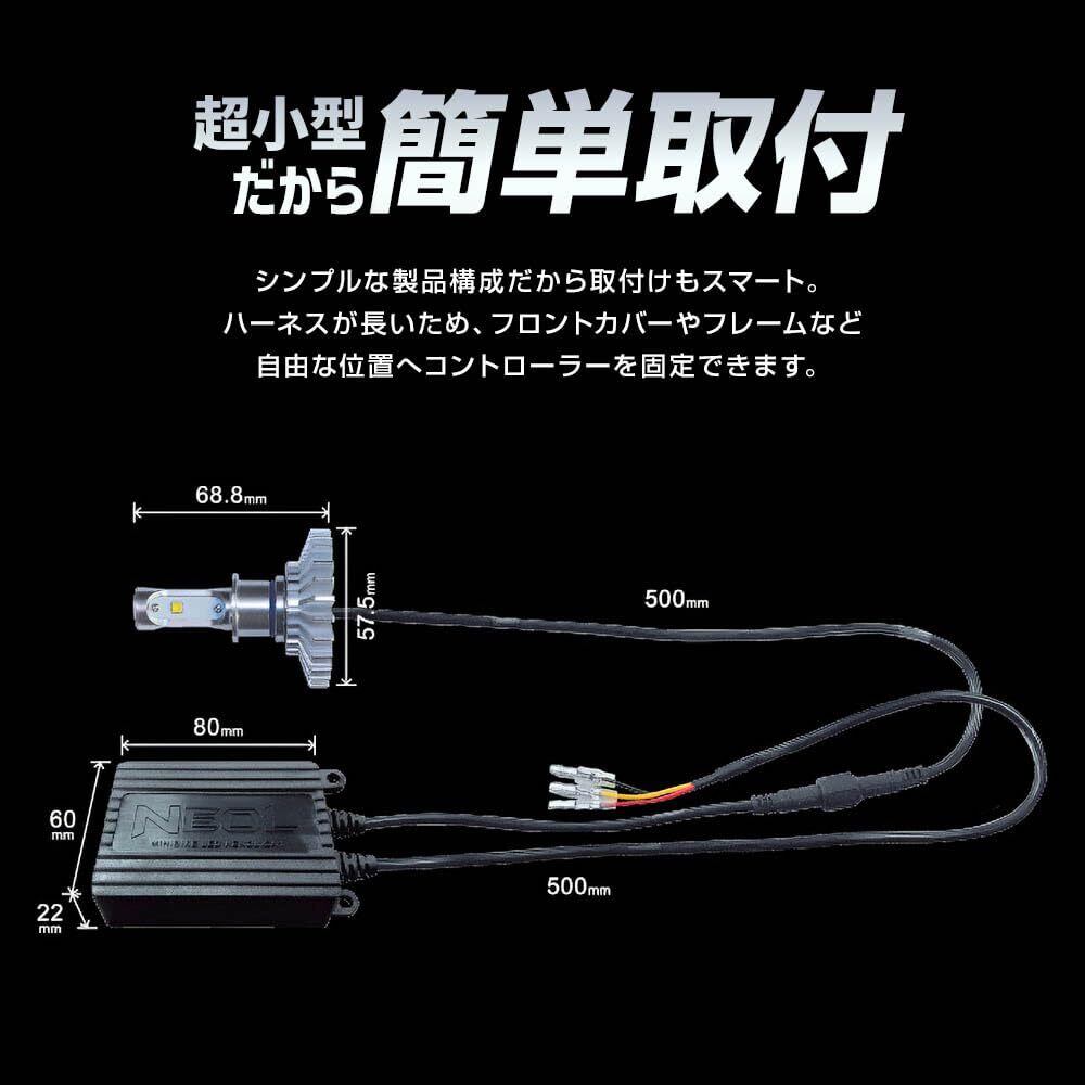 【製品仕様】商品名:ミニバイク用LEDヘッドライト NEOL(ネオル)、形状:PH7型、明るさ:Hi 2600lm / Lo 2000lm、カラー:6000K(ホワイト)、対応電圧:DC/AC(直流/交流)兼用、入り数:1本、保証:お買い上げより1年間
