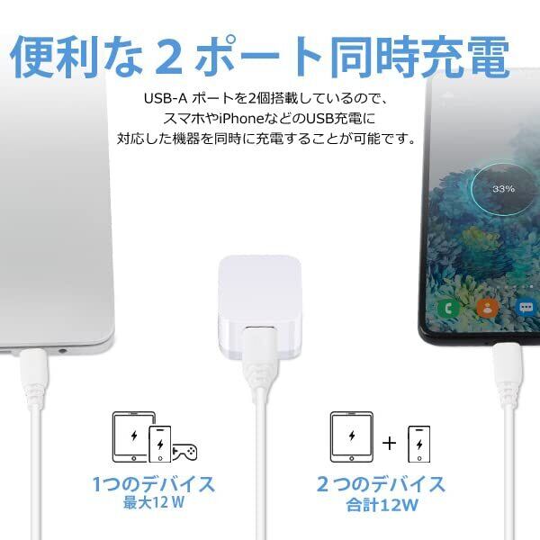 【2台同時スマート充電可能】Type-A充電器は2つusbポート合計5V/2.4Aの高出力で2台のUSB機器が同時にフルスピード充電可能です。充電速度は従来製品と比べ3倍以上速くなります。(※同時に充電する場合、2つのデバイスの間で12Wの電力を巧みに分配し、効率よく充電できます。)