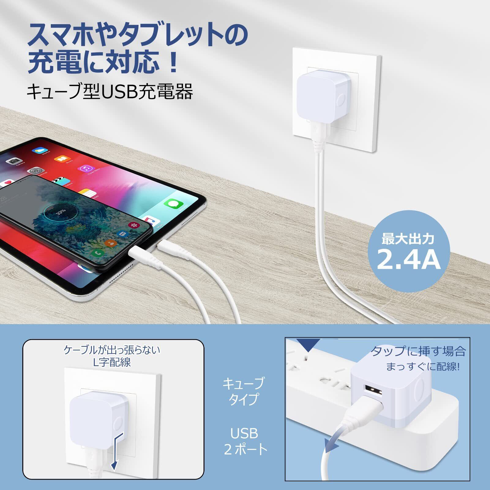 usb コンセント 2ポート usb 充電器 iphone 充電器 acアダプター 携帯充電器 iphone充電器 iPoto コンパクト スマホ 充電器 【PSE済/2.4A/ キューブ型/L型】 アンドロイド充電器 軽量 きゅうそく充電器 アイフォン 充電器 iPhone Android 対応 ホワイト