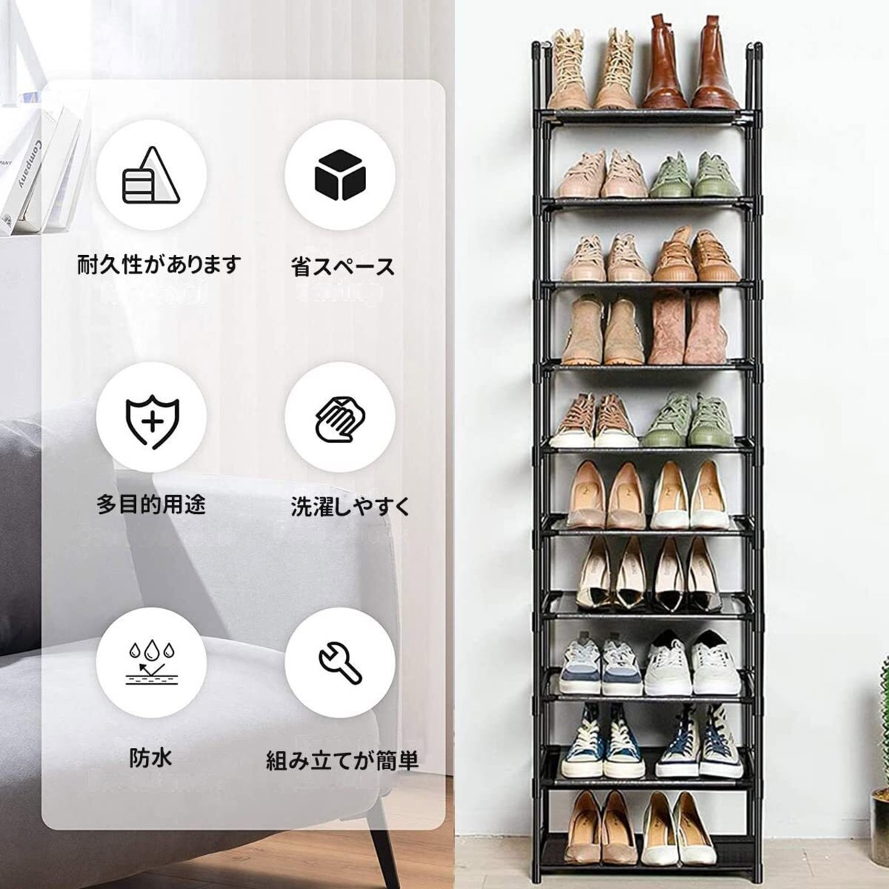 【シューズラック 丈夫でしっかりとしている】この靴ラックは塗装を施した上質な鉄棒と防水ラミネート加工不織布が使われています。①シューズラック 鋼管-直径13mmのプラスチック 塗装を施した上質な鉄棒は、錆びることがなく、腐食してしまうこともありません。②防水ラミネート加工不織布-防水仕様で通気性も良く、洗濯しやすく、長く使用することができます。③高強度環境配慮型PPプラスチックコネクタ-耐久性があります、変形しにくいです。