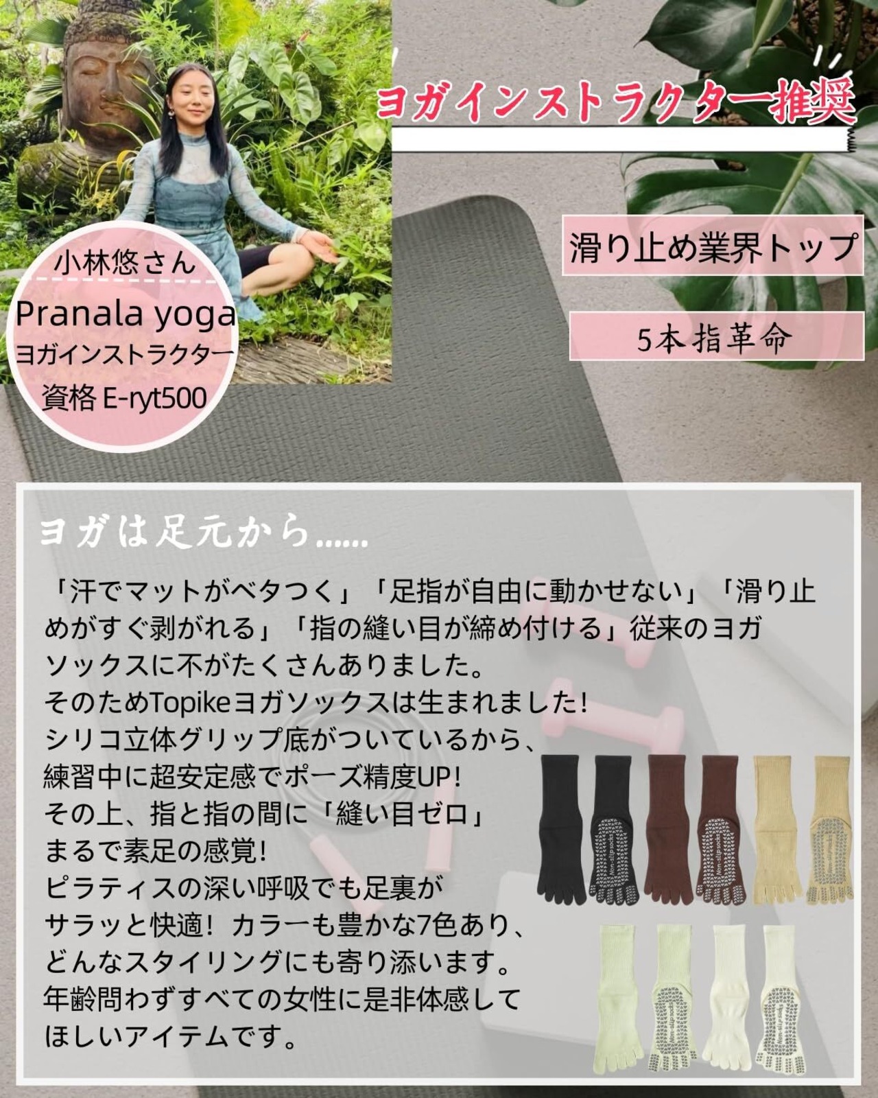 Point 1【商品詳細】ヨガ・ピラティス・ダンス等に大人気の滑り止め付き5本指ヨガソックスが新登場!①日本サイズ:約22.5-25cm対応②素材:コットン、ポリウレタン(滑り止め:シリコン)③カラー:ブラック、ホワイト、グリーン、ライトグレー、カーキ、ダークグレー、ブラウン
