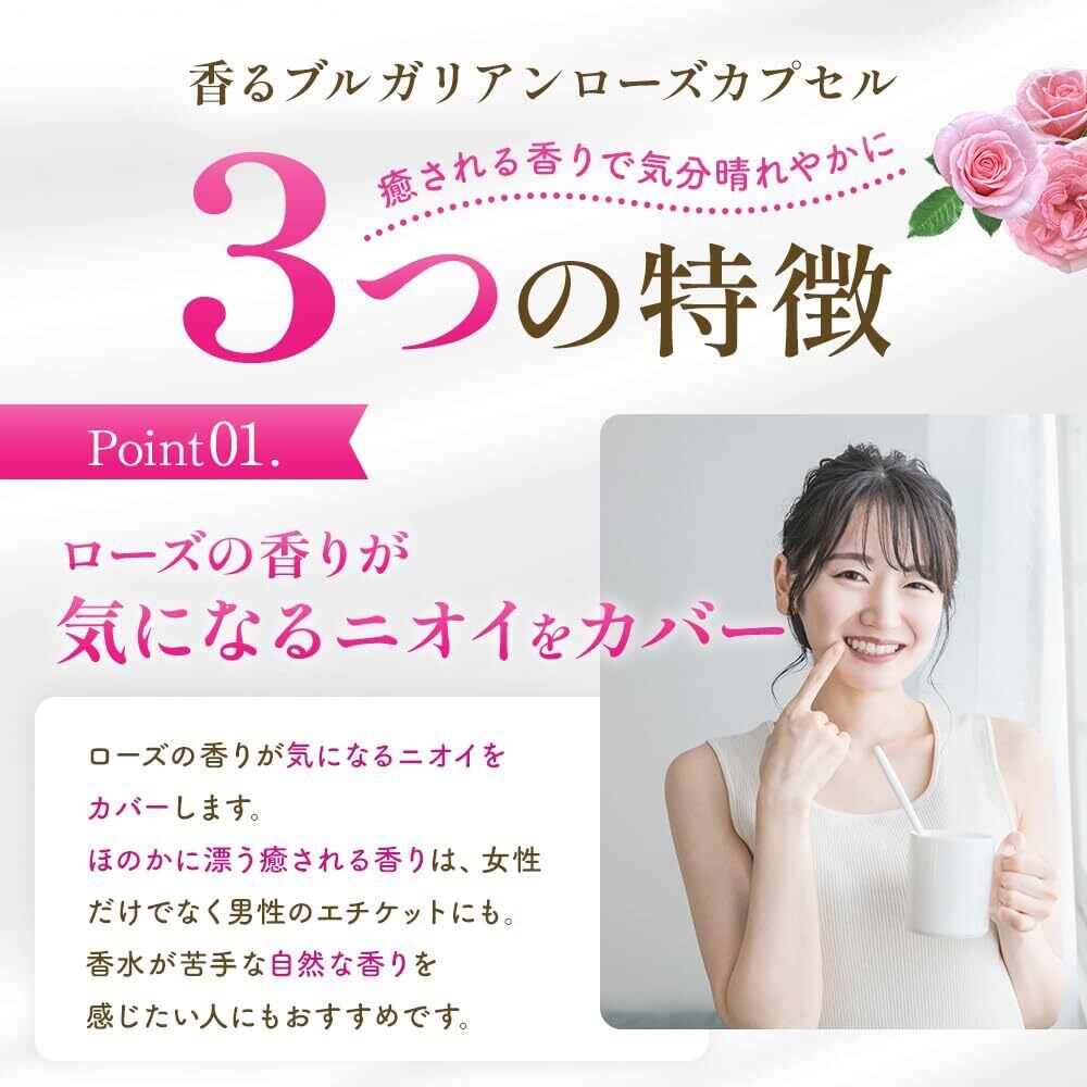 シトロネロール、ゲラニオールといった香りの成分が含まれるローズオイルを配合。1袋あたりバラの花約850本分(※)の天然香気成分を凝縮しました。最高級といわれる天然ダマスクローズを100%使用したローズオイルを、1日目安量あたり11mg摂ることができます。臭いが気になる方に。