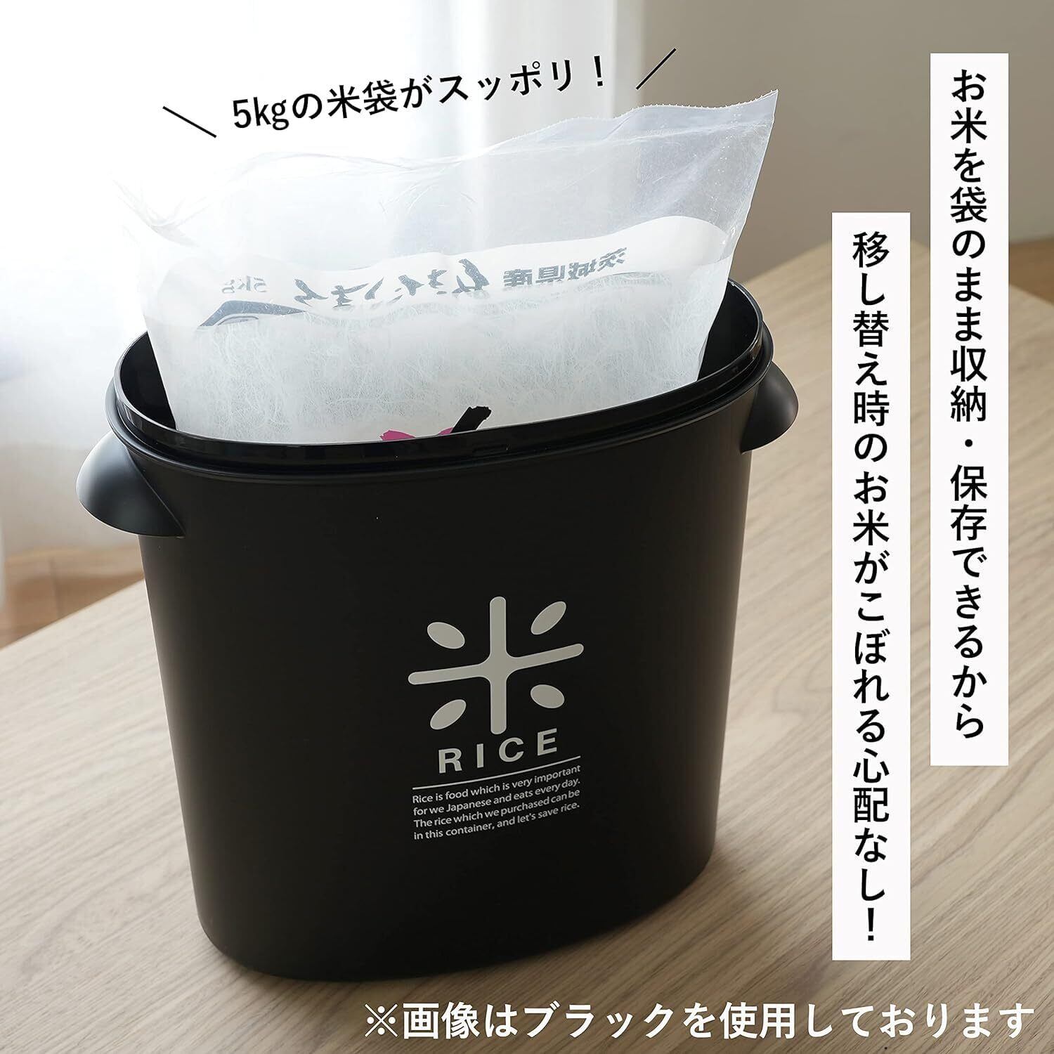 5kgのお米を袋のまま収納・保存できるので、面倒な移し替えの手間が省けます