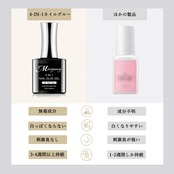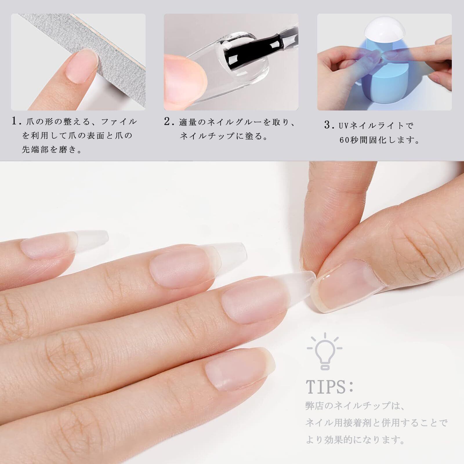 【注意事項】1.本品はUV/LEDランプと一緒に使用する必要があります。2.爪を過度に削らないでください。3.使用前にスキンテストを行ってください。4.ライトで硬化して接着するので、チップがクリアなもの(ライトが貫通するもの)でないと接着できません。完全に透明でなくてもクリアカラーのチップ(サンディング済みチップなど)であれば接着できました。