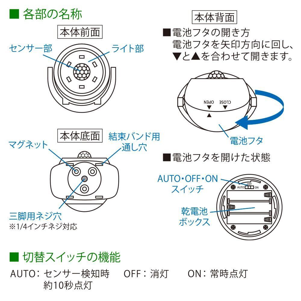 【 仕 様 】 ◆光源:LED×6個(交換不可)/昼白色 ◆全光束:約100ルーメン ◆人感センサー検知範囲:約5m 上下約90° ◆点灯保持時間:約10秒 ◆スイッチ切替機能:AUTO/OFF/ON ◆電源:単3形乾電池×3本(乾電池別売)