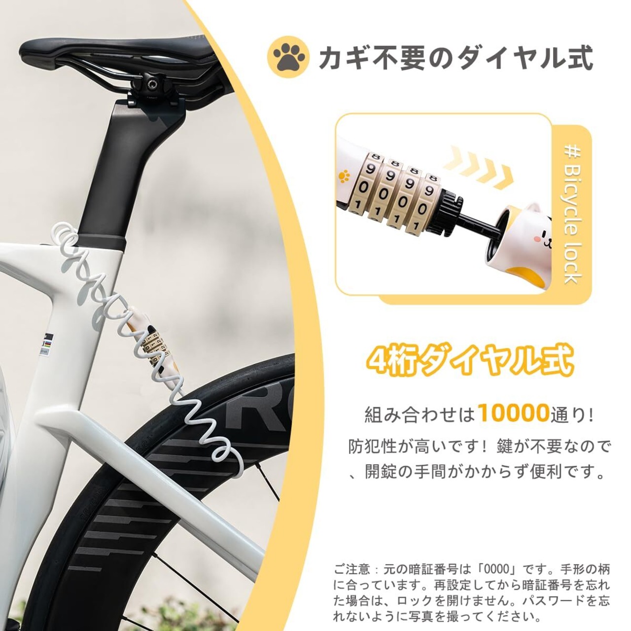 【カギ不要・4桁ダイヤル式】4桁数字を作る組み合わせは実に10000通りでワイヤーロックの防犯性が高いです!鍵が不要なので、開錠の手間がかからず便利です。また、鍵の忘れ、紛失などの問題も避けられますよ。(ご注意:元の暗証番号は「0000」です。手形の柄に合っています。再設定してから暗証番号を忘れた場合は、ロックを開けません。パスワードを忘れないように写真を撮ってください。)