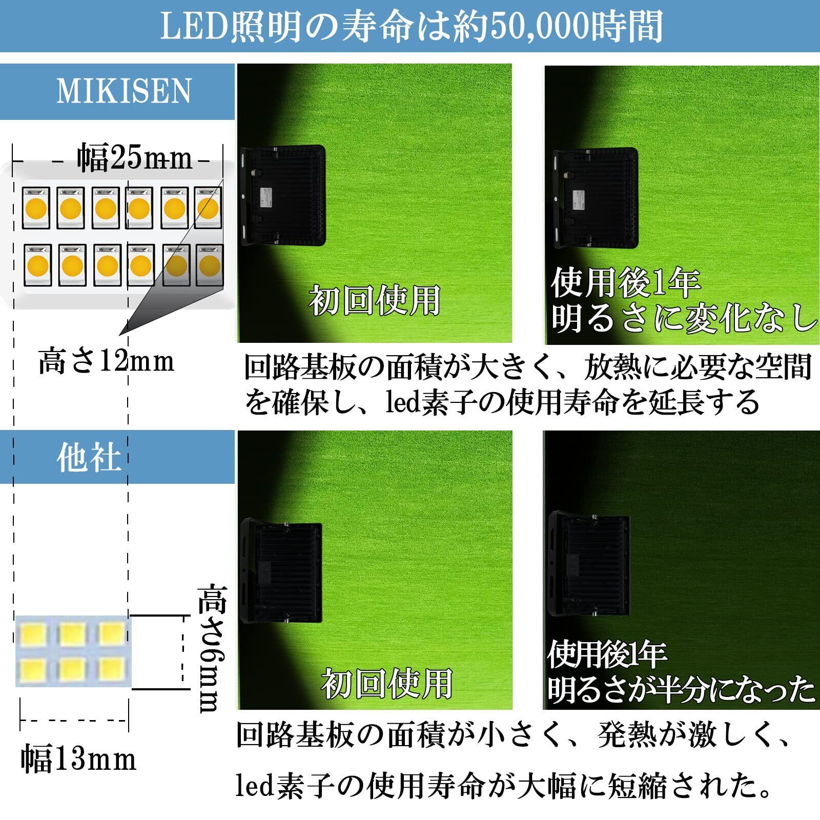 【50000時間の使用寿命を確保】 led設計の使用寿命は最大は60000時間ですが、実際の使用環境では、特に過酷な使用環境ではled使用寿命が激減し、60000時間の設計寿命に達するのは難しくなります。MIKISENは高放熱構造を採用して、防水通気フィルタ付き、結露を抑え、製品の使用寿命を50000時間に伸ばすことができます。