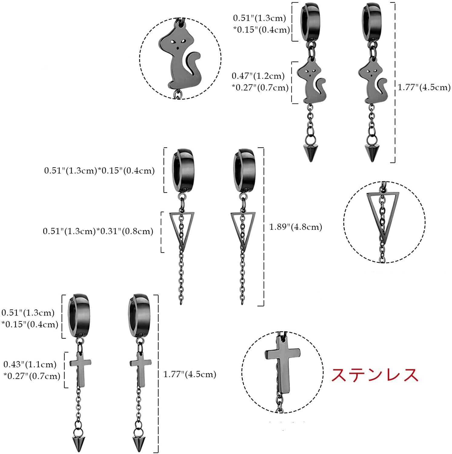 材料:ステンレス フープピアス長さ*広さ:約0.51"(1.3cm)*0.15"(0.4cm) ペンダント長さ*広さ:約 0.47"(1.2cm)*0.27"(0.7cm) 重量:10g