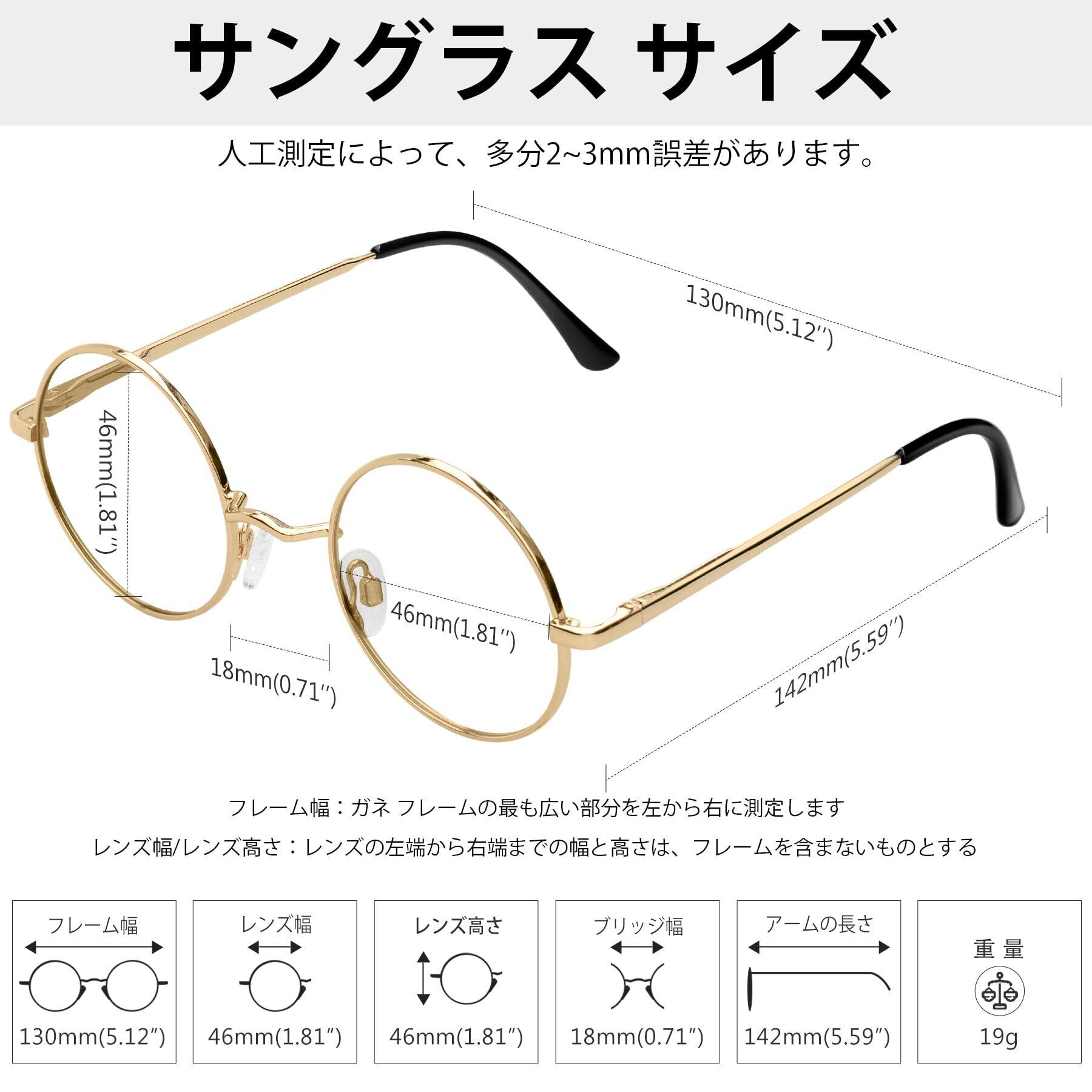 商品仕様: レンズ幅:46 mm(レンズの左端から右端までの幅は、フレームを含まないものとする ) レンズ高さ:46 mm(レンズの上端から下端までの高さは、フレームを含まないものとする) 全体のよこ幅:130mm(メガネ フレームの最も広い部分を左から右に测定します)ブリッジ幅:18 mm;アームの長さ:142 mm;重量:約19g;ご注意:人工測定によって、多分2~3mm誤差があります