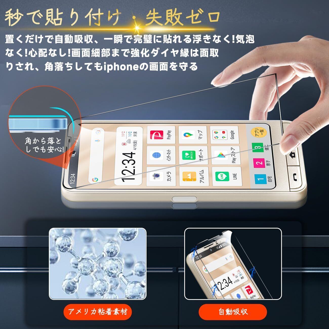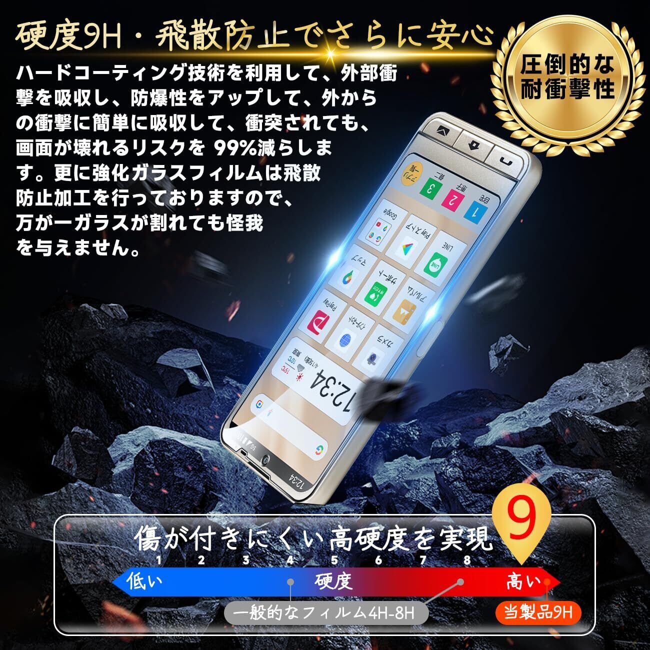 【高品質の材料の9H硬度】とレンズ保護フィルムはすべて旭硝子で作られており、スマホ保護フィルムの中で最高レベルの9H硬度に達しています、4.5時間以上の高温焼入れ処理を行い、スクリーンプロテクターの圧強度は 125mpa に達し、通常 ガラス の 5 倍になりました。しかもスクリーンプロテクターは衝撃を抑えるシリコンコーティングを内蔵しており、万が一ガラスが割れても、ガラスの破片が飛散しません。ハードコーティング技術は、衝撃を最小限に抑えて画面の破損を抑え、すり傷防止や指紋防止もしっかりとスクリーンを保護します。*大切な携帯電話の液晶画面を保護し、衝撃や表面のキズを防止します。