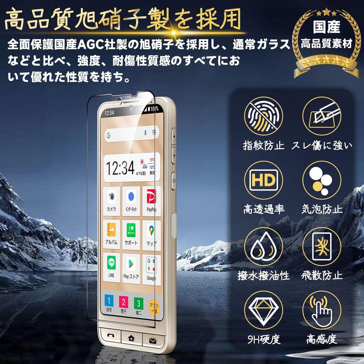 特徴 ⓵国産AGC製素材旭硝子製 ⓶9H硬度 ⓷指紋認証鋭敏、指紋防止良い効果 ⓸気泡なし 極薄 ⓹高光沢仕様 ⓺高透過率 99.9% ⓻飛散防止 ⓼ 簡単貼り付け 自動吸着