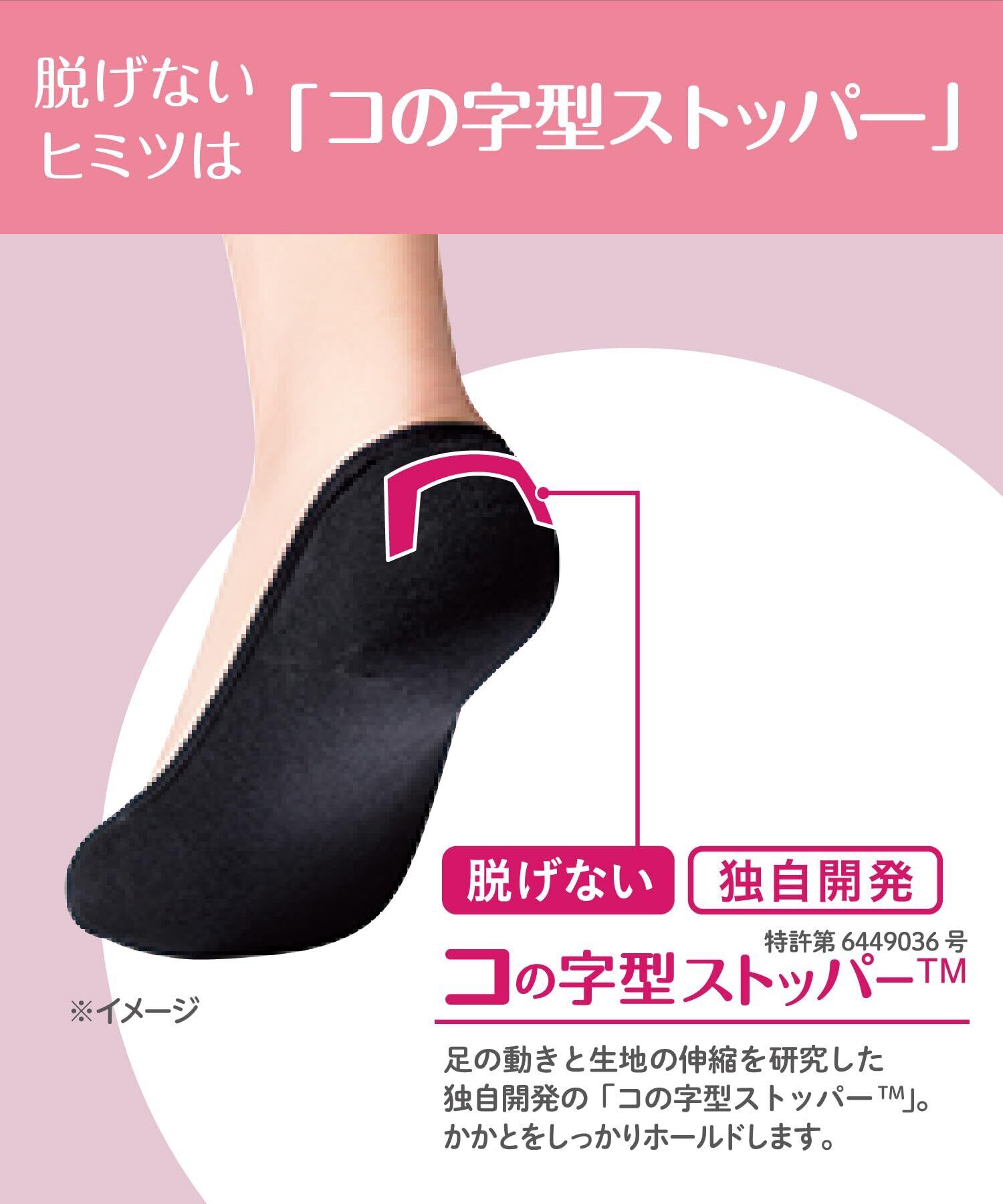 【一日中、脱げない】足の動きと生地の伸縮を研究した独自開発・特許技術の「コの字型ストッパー」がかかとをしっかりホールドし、「一日中、脱げない」を実現。階段を上っている時も、走っている時も、靴を脱ぐ時も、脱げません。