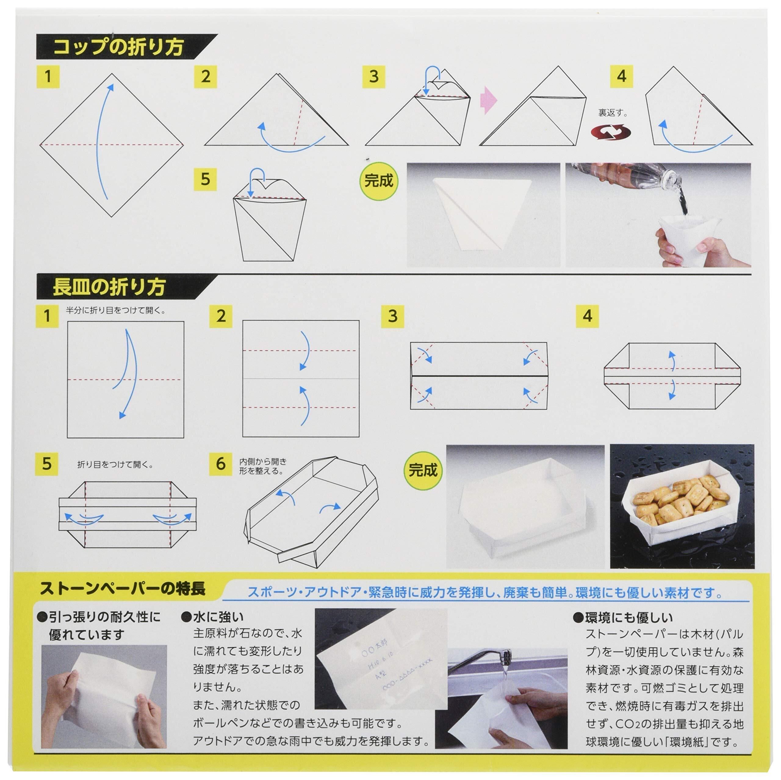 スポーツ、アウトドア、緊急時に大活躍する携帯食器を作れる折り紙 特殊素材で洗って繰り返し使える 熱湯消毒、台所漂白剤での除菌・漂白、食器用洗剤での水洗いが可能! コップ・皿などの織り方説明書付き