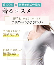 質の良い綿を使用した「コットン100%」インナーです。「保湿効果」・「肌に優しい」・「清潔さ」をサポートする3つの天然美容成分を配合しています。「うる肌・・・スクワラン」「きれ肌・・・コラーゲン」「抗菌・防臭…涙に含まれている抗菌成分を配合。」 脇に縫い目がないやさしい肌ざわりです。