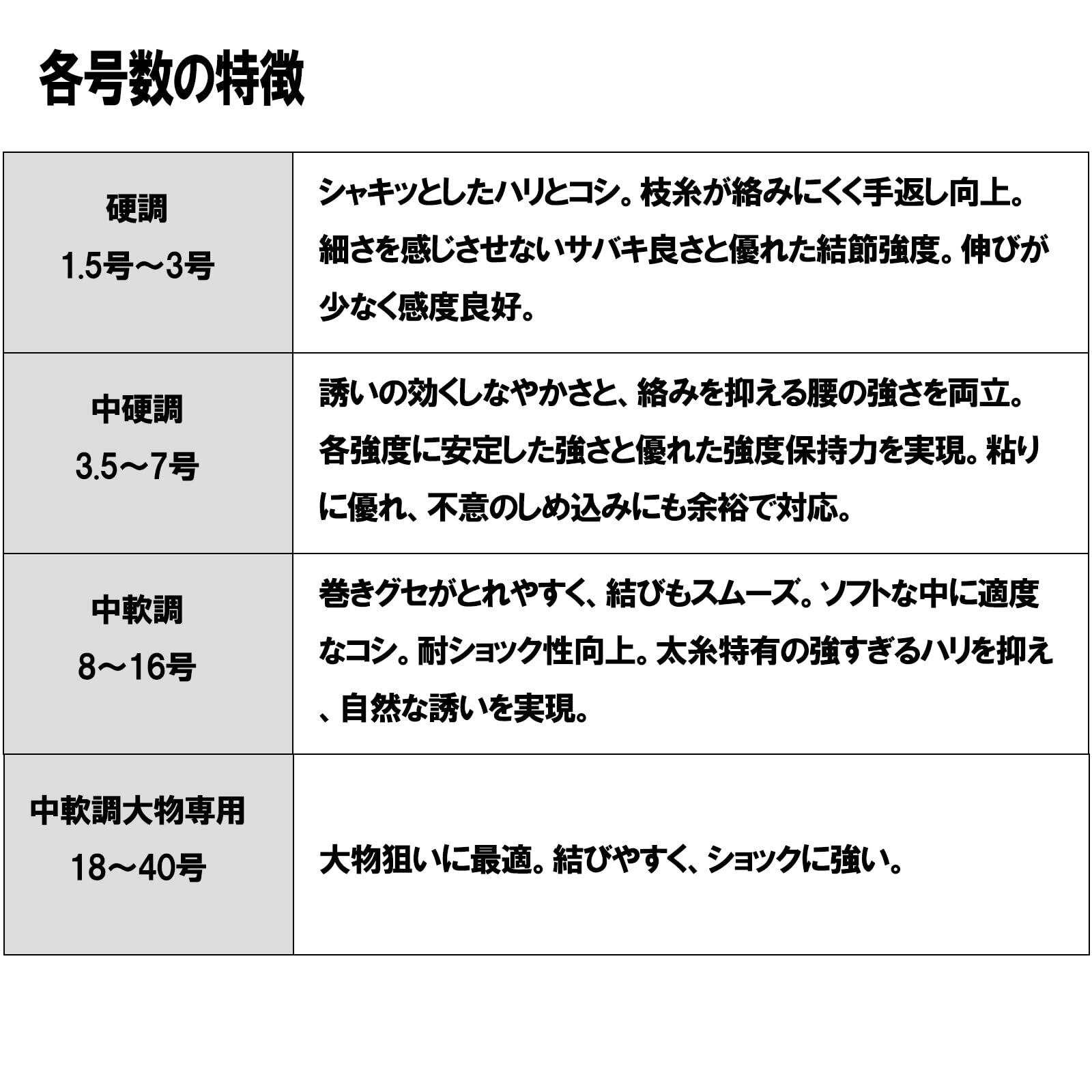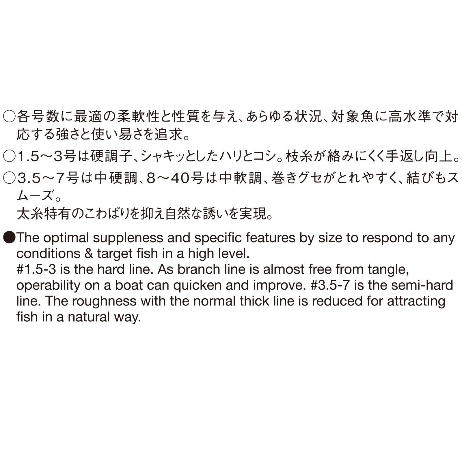 1.5号~3号は硬調子、シャキッとしたハリとコシ。枝糸が絡みにくく手返し向上。3.5~7号は中硬調子、8~40号は中軟調、巻グセがとれやすく、結びもスムーズ。太糸特有のこわばりを抑え自然な誘いを実現しています。