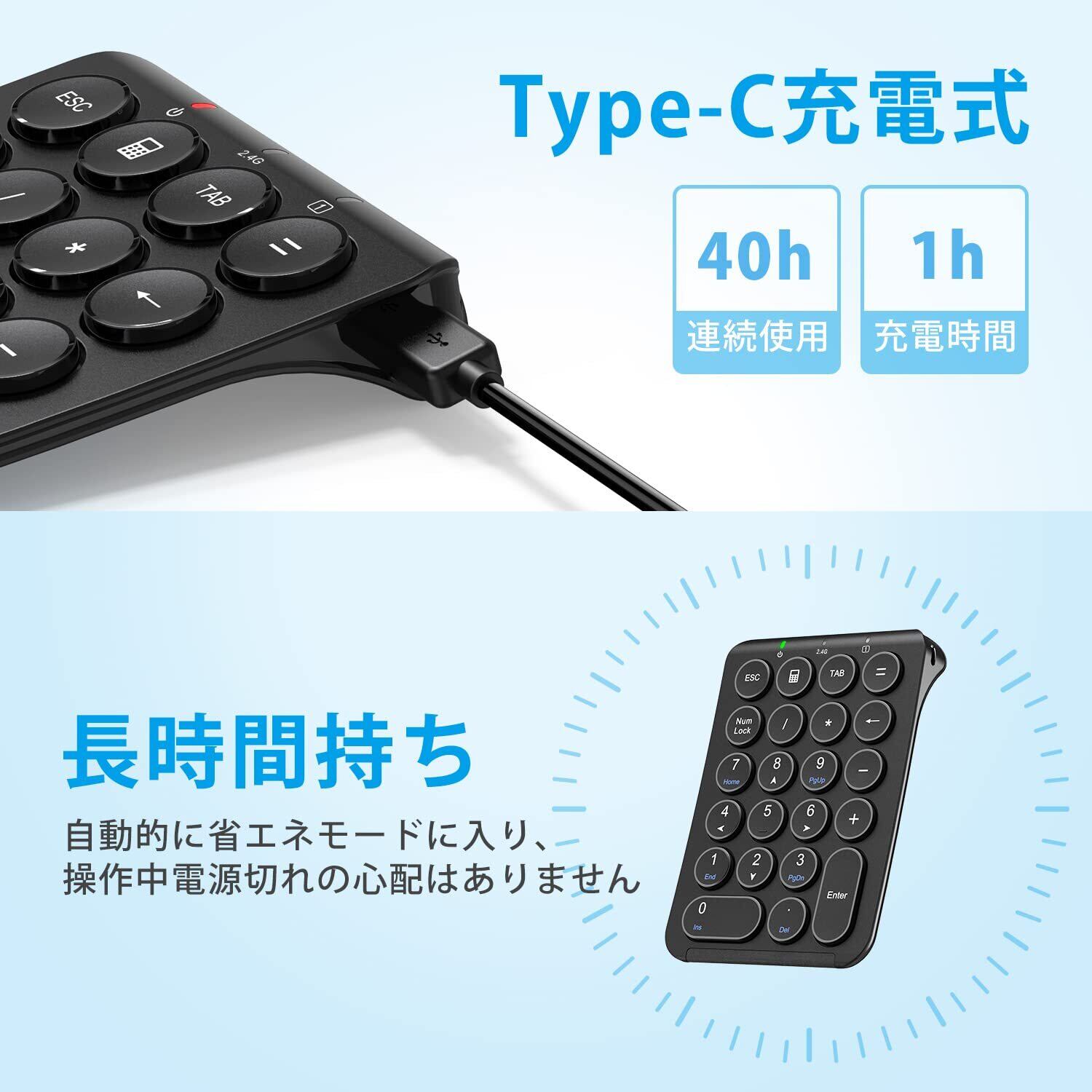 【Type-C充電&省エネ設計】便利なType-C充電ポートを搭載し、約1時間でフル充電が可能。最大40時間の連続使用に対応します。さらに、省電力機能を備え、20秒間操作がないと省電力モード、10分間操作がないとスマートスリープモードへ自動移行し、無駄な電力消費を抑えます。