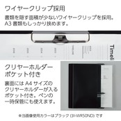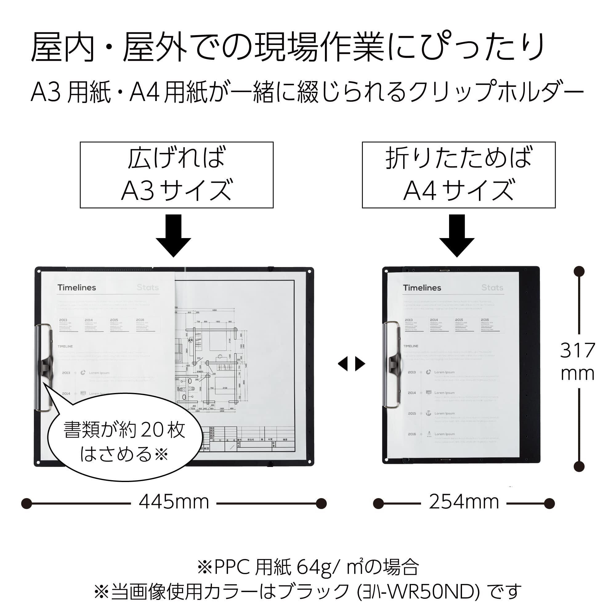 色:ブラック ■■A3でもA4でも書きやすく持ち運びも快適な2wayクリップボード■■・広げればA3・折りたためばA4に筆記面のサイズを使い分けできるので、書きやすく、またかさばらずに持ち運びができます。・屋外で書類が風にあおられにくくするためのゴムバンド付き。表紙止めにもなるのですっきりと持ち運べます。・デスクの引き出し(横幅318mm以上)に入るコンパクトサイズです。・発泡PP製の表紙は丈夫でかつ軽量なので、書類の持ち運びや屋外での使用にも適しています。・裏側にはA4書類をクリヤーホルダーに入れたまま収容できるポケット付きです。ペンも数本挟むことができます。・四隅にヒモ通し穴付きです(穴径約5mm)。・汚れが目立ちにくい本体色です。商品仕様・外寸法/展開時:高さ317×幅445×厚み7mm(クリップ部16mm)・材質/外板:発泡R-PP、内板・ポケット:R-PP