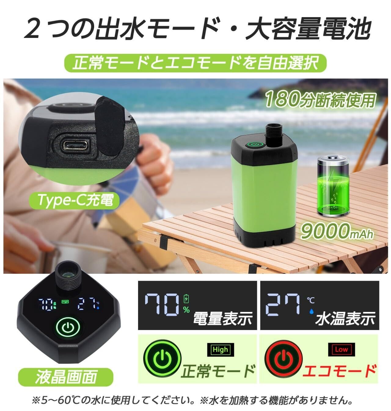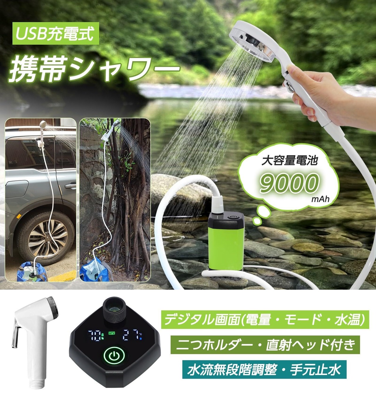 【9000mah大容量・2つ出水モード】電動シャワーに9000mah充電式バッテリーが内蔵されており、約180分断続使用可能です。USBポートを搭載するパソコン、モバイルバッテリー、ACコンセントに差し込むだけで充電できます。さらに、ポータブルシャワーは正常モードとエコモードの二つの出水モード機能があり、使用シーンにより自由に選択できます。