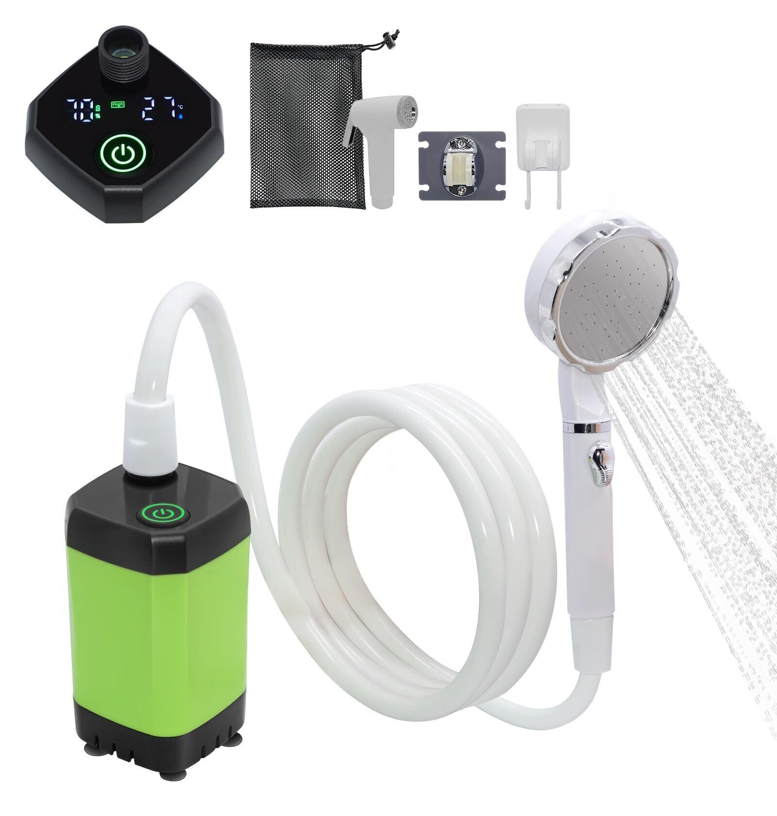 【1年保証・注意事項】シャワーポンプは10℃~60℃の水に使用してください。シャワーポンプは水を加熱する機能がありません。セット内容:ホース、ポンプ本体、シャワーヘッド、直射ヘッド、3in1ホルダー、フックホルダー、吸盤、収納袋、日本語説明書。お客様に安心してお買い物をしていただくために当店は1年間安心保証をご用意いたしました。商品の初期不良などがあった場合、お気軽にお問い合わせください。