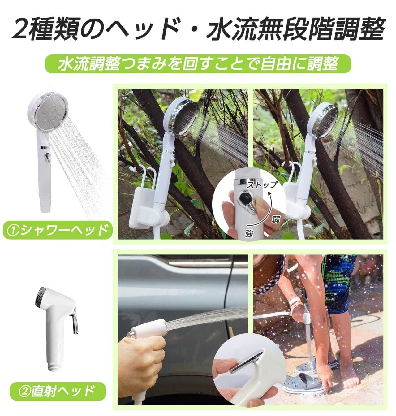 【直射ヘッド・2つホルダー付き】このポータブルシャワーには直射ヘッドが贈り、用途によって自由に切り替えることができます。付属品の3in1ホルダーとフックホルダーを使って、シャワーを壁や車のボディーなどに取り付けて使用し、両手を解放します。屋内/屋外シャワー、キャンプ、旅行、子供用入浴、ペットの掃除、洗車、庭の植物の水やりなどについてご安心してご利用のポータブル電動シャワーです。