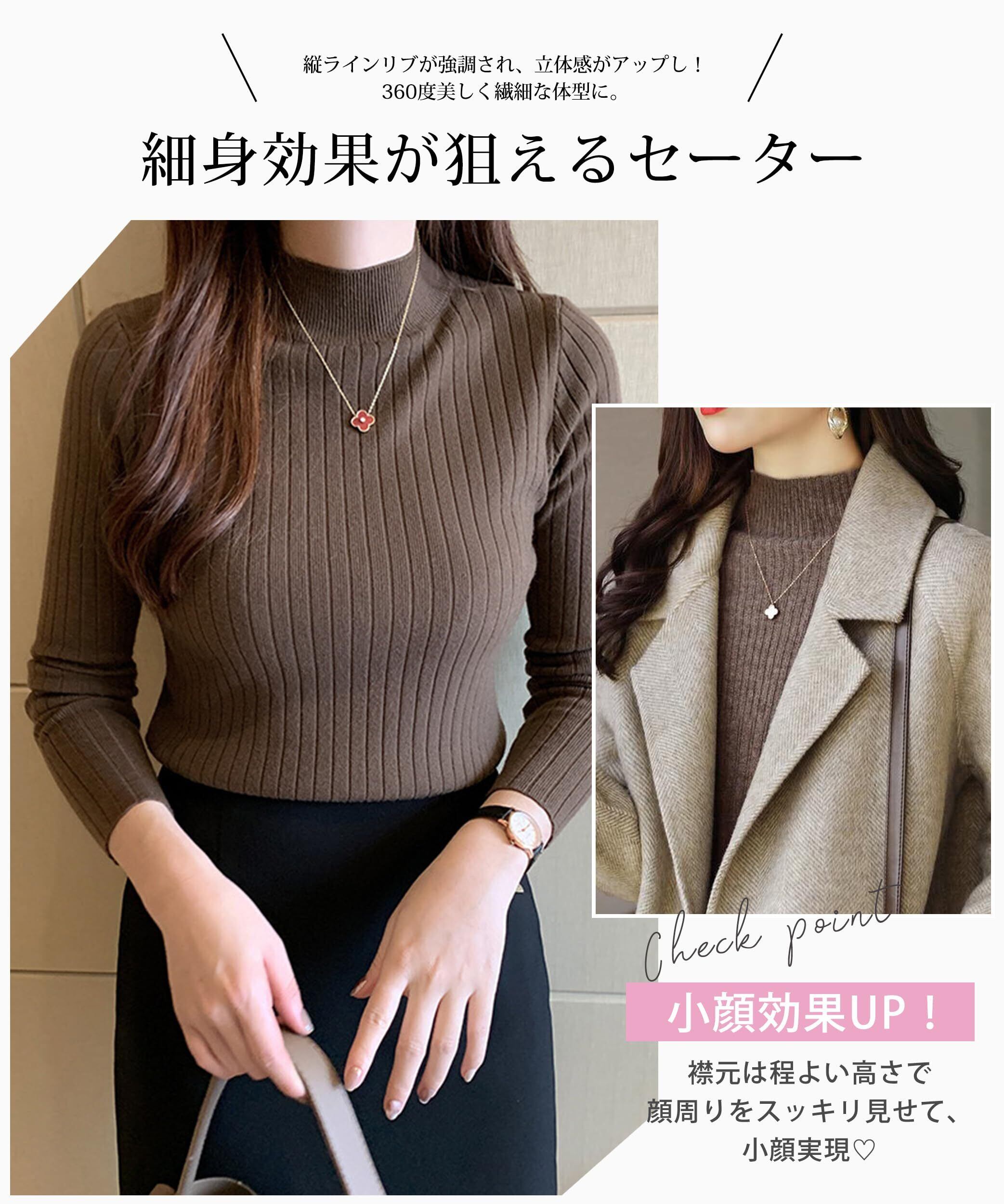 【縦リブ・細身効果引き出し】当店のセーターはハイネック部分から腕先まで、縦のラインリブが強調します。立体感がアップし、360度美しく繊細な体型を描きます。リブニットの垂直ラインはあなたにもっと美しい体型を引き立て、細見え効果も出てきます。裾、袖からチラ見せさせれば体型カバーや着痩せコーデも叶います。体にピッタとフィットして、女性らしいキレイなシルエットに見せてくるリブニットです。