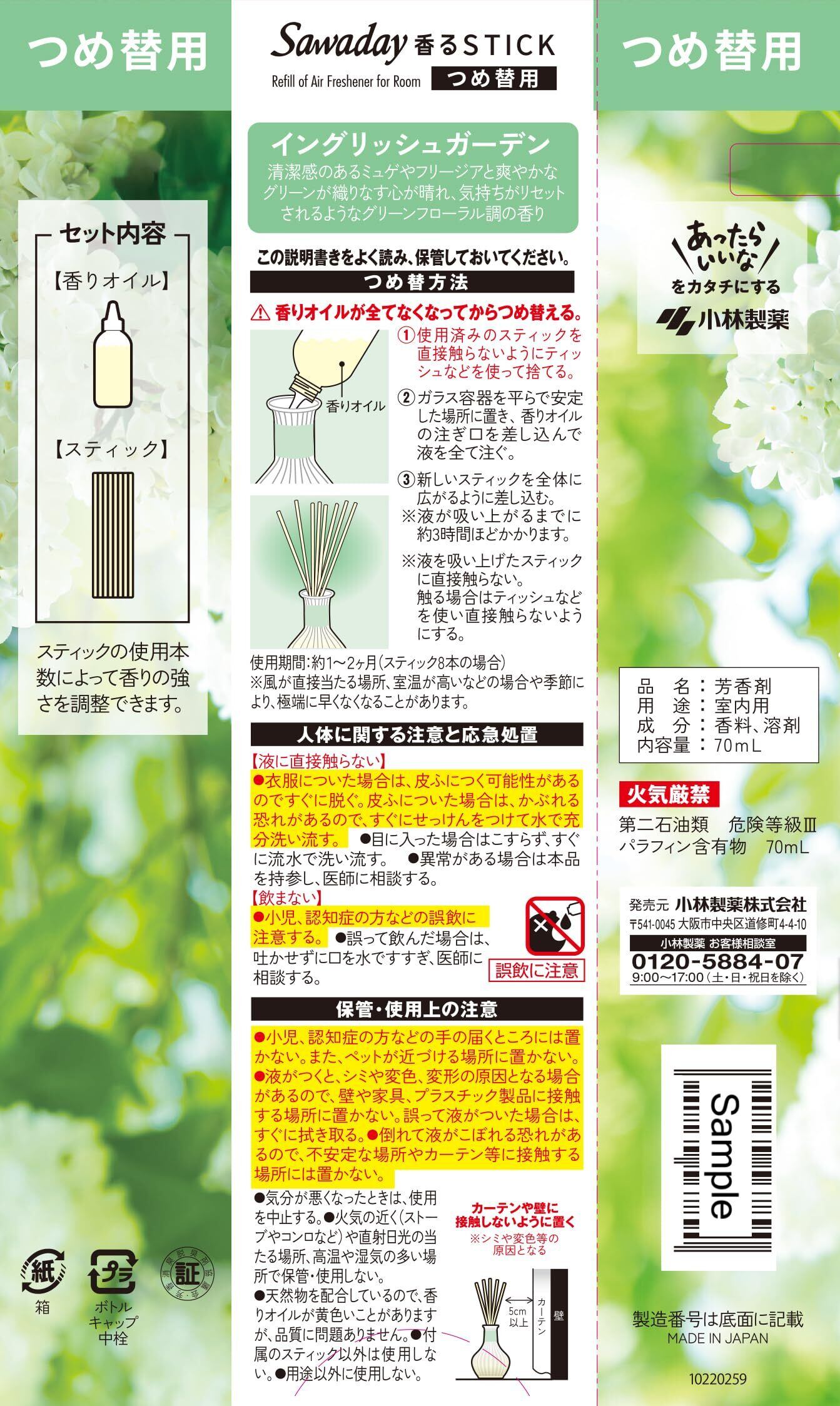 ●つめ替用●厳選された香りオイルを使った上質な香りが、スティックを通してお部屋全体に広がります 。●心が晴れ、気持ちがリセットされるようなグリーンフローラル調の香り。●天然由来香料を配合した気持ちリセット香料を採用。●使用期間:約1~2ヶ月(スティック8本の場合)※風が直接当たる場所、室温が高いなどの場合や季節により、極端に早くなくなることがあります。