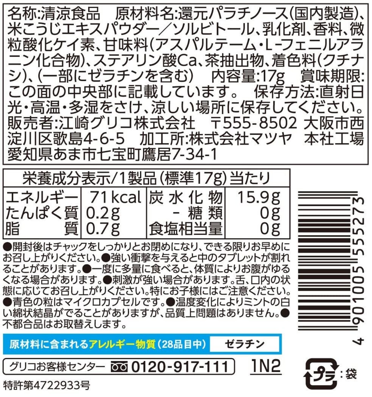 還元パラチノース(国内製造)、米こうじエキスパウダー/ソルビトール、乳化剤、香料、微粒酸化ケイ素、甘味料(アスパルテーム・L-フェニルアラニン化合物)、ステアリン酸Ca、茶抽出物、着色料(クチナシ)、(一部にゼラチンを含む)